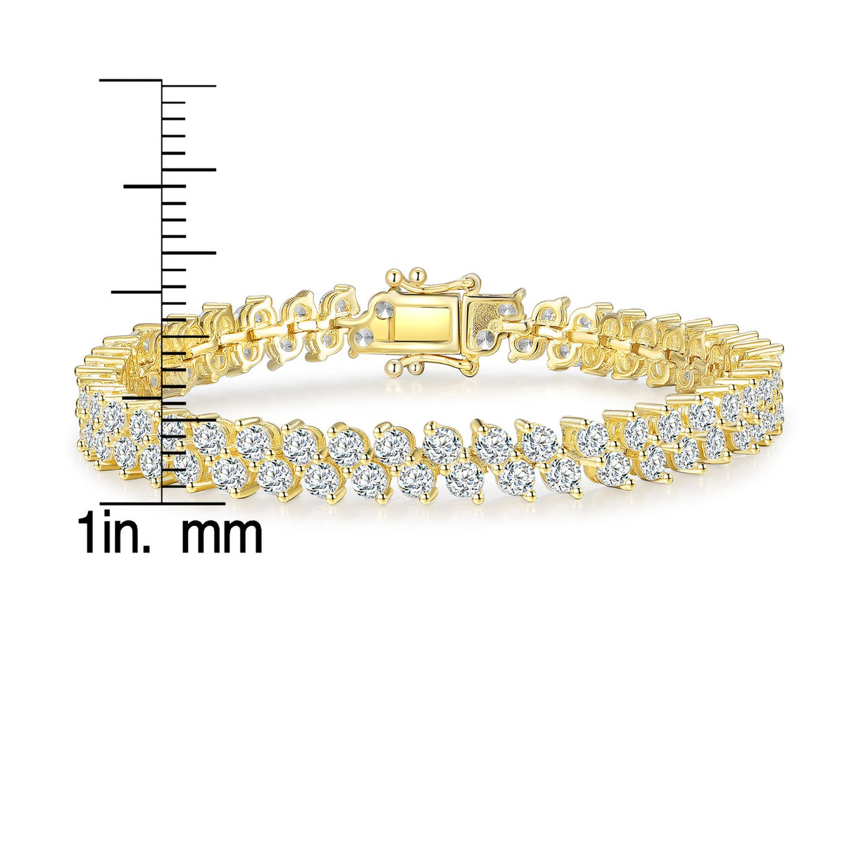 This tennis bracelet is crafted from sterling silver with gold plating and features cubic zirconia. It has a slide/box clasp with two figure-eight safeties. To maintain its quality, use a suede cloth to clean it and avoid contact with water.