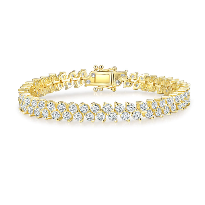 The Sterling Silver Gold Plated With Cubic Zirconia Icicle Cluster Double Row Tennis Bracelet by Genevive Jewelry is a glamorous and elegant accessory. This dazzling tennis bracelet features glittering round brilliant cut cubic zirconias that give it an air of elegance. The stones are securely prong-set in groups of two and are crafted in sterling silver.