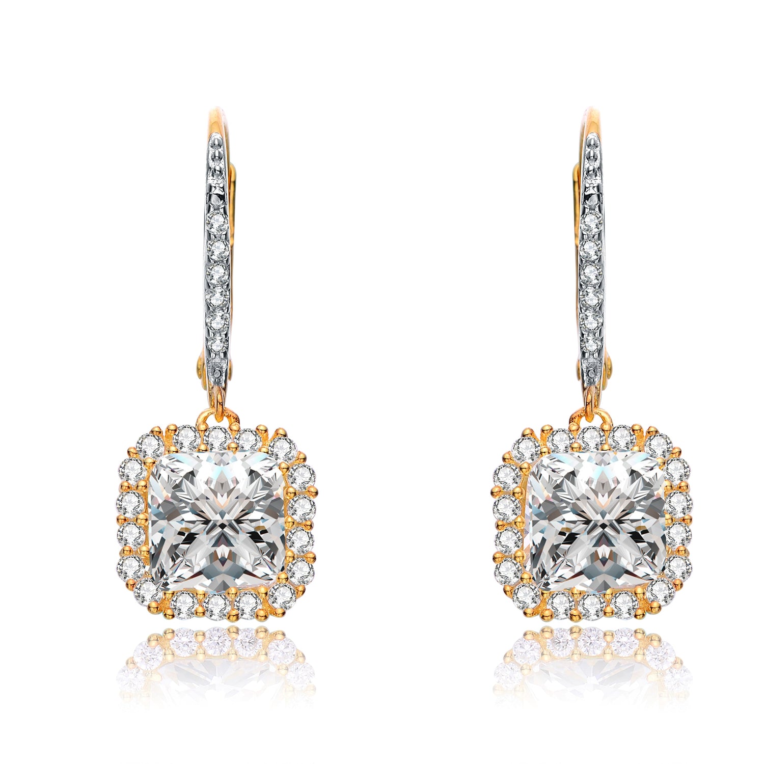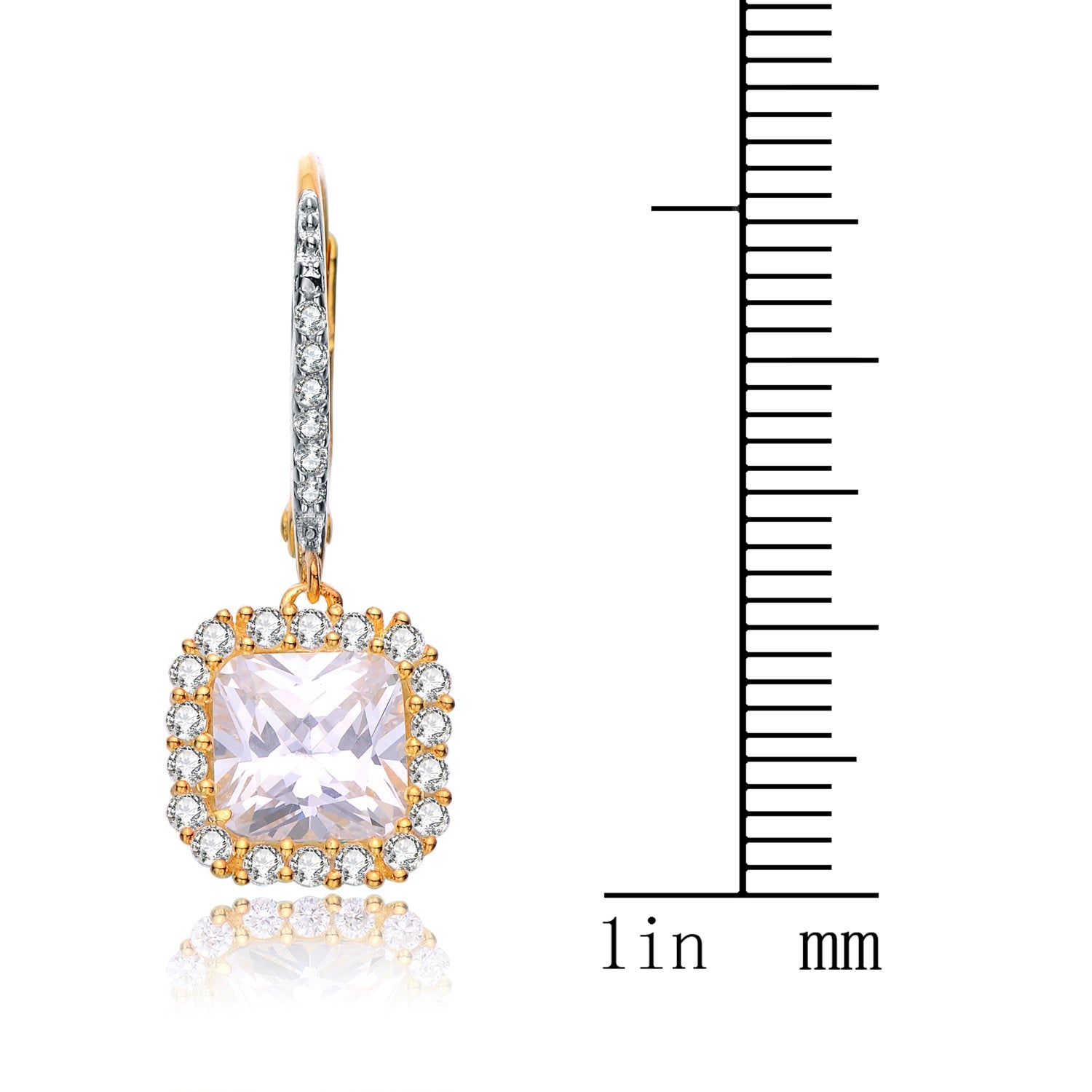 The Sterling Silver Gold Plated Cubic Zirconia Square Drop Earrings by Genevive Jewelry are elegant and sparkling. These dangle earrings feature a princess cut cubic zirconia solitaire enveloped by a halo of smaller cubic zirconia stones. They are crafted of sterling silver and are secured with a leverback closure.
