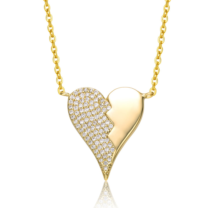 Teens Sterling Silver Yellow Gold Plated With Cubic Zirconia Broken Cracked Zig-Zag Half & Half Stolen Heart Pendant Necklace