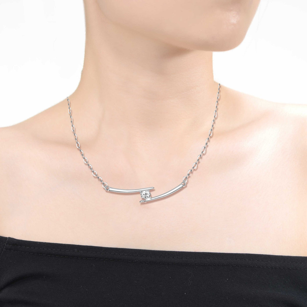 The Sterling Silver With Cubic Zirconia Solitaire Double Bar Pendant Necklace by Genevive Jewelry is an elegant and artistic accessory. This necklace features a glittering round brilliant cut cubic zirconia solitaire that sits in a shiny double bypass bar pendant. A delicate chain suspends this artistic pendant, which is finished with a lobster clasp.
