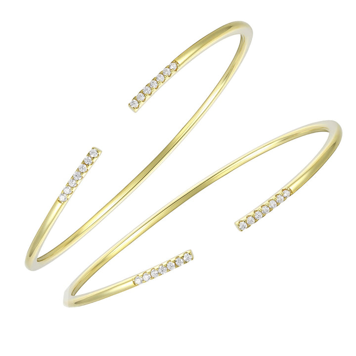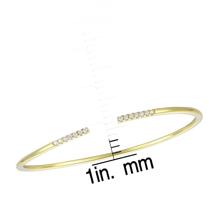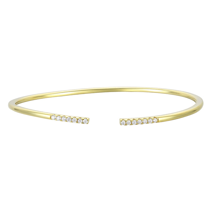 This cuff bracelet is made with 14K gold plating and features small clear round cubic zirconia stones. It is secured by pushing the cuff down slightly.