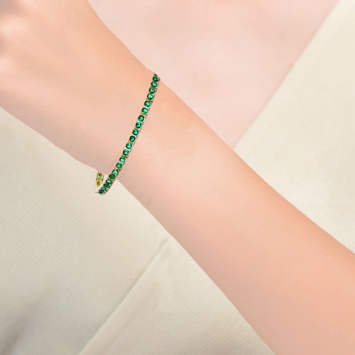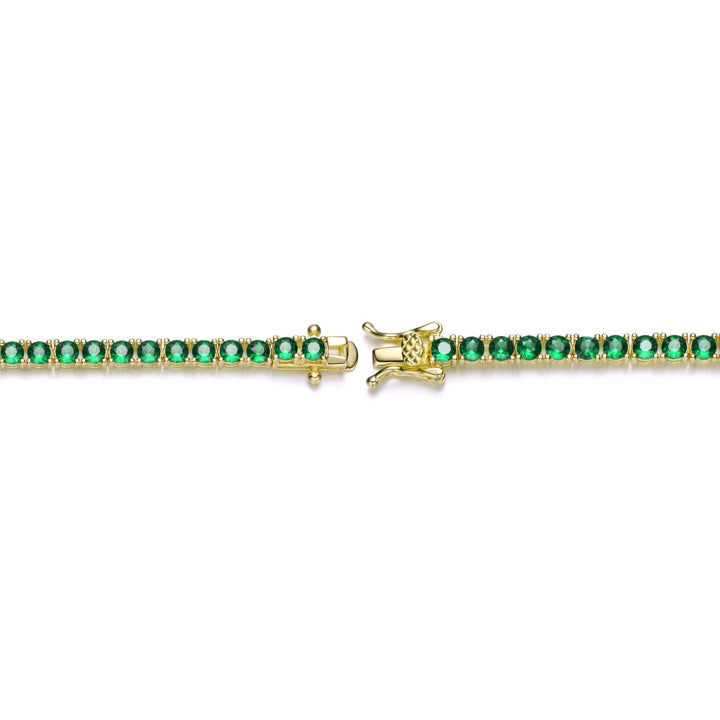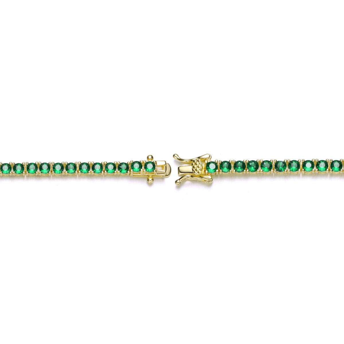 This tennis bracelet is made of 14k gold-plated metal and features cubic zirconia gemstones in an emerald green color.