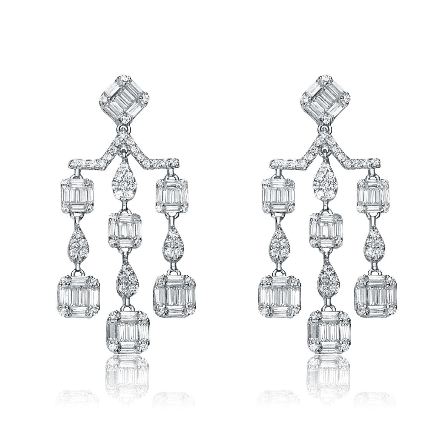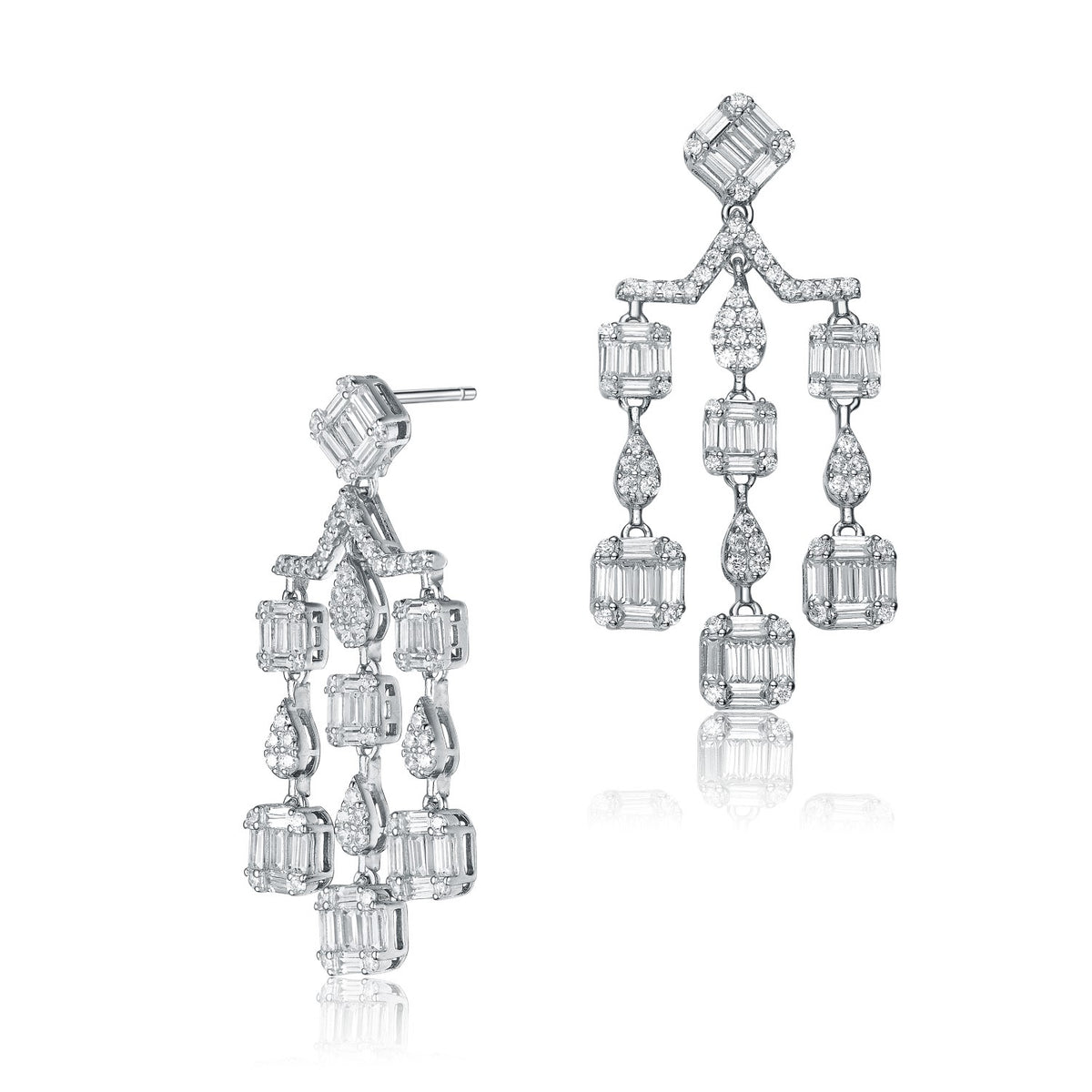 These chandelier earrings are crafted from sterling silver and feature cubic zirconia stones in a scale-like pattern.