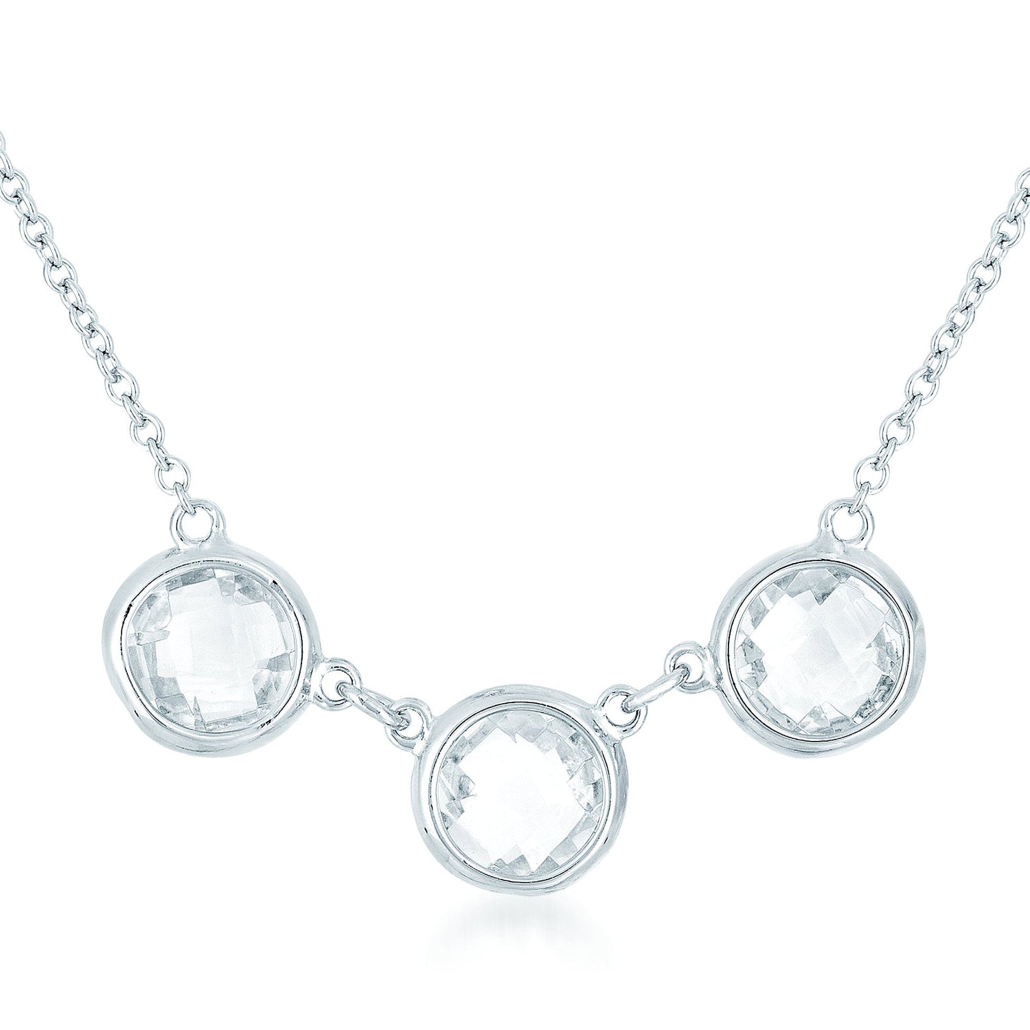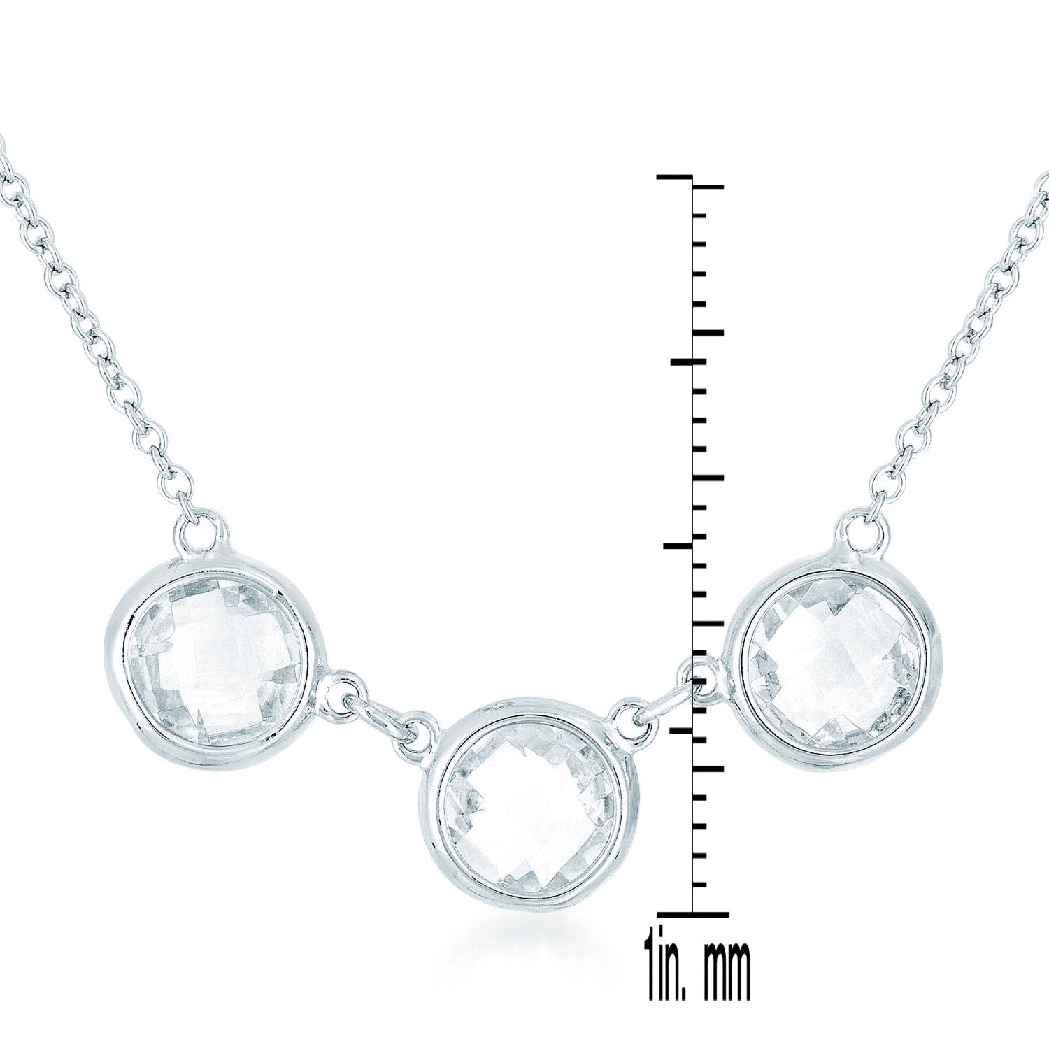 This necklace is crafted from sterling silver and white gold plated material. It features three round clear cubic zirconia stones.