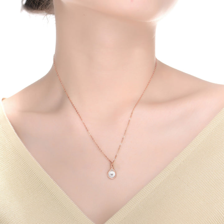This necklace is crafted from .925 Sterling silver with rose gold plating. It features a white round shell pearl and clear round cubic zirconia, and it secures with a spring ring clasp.
