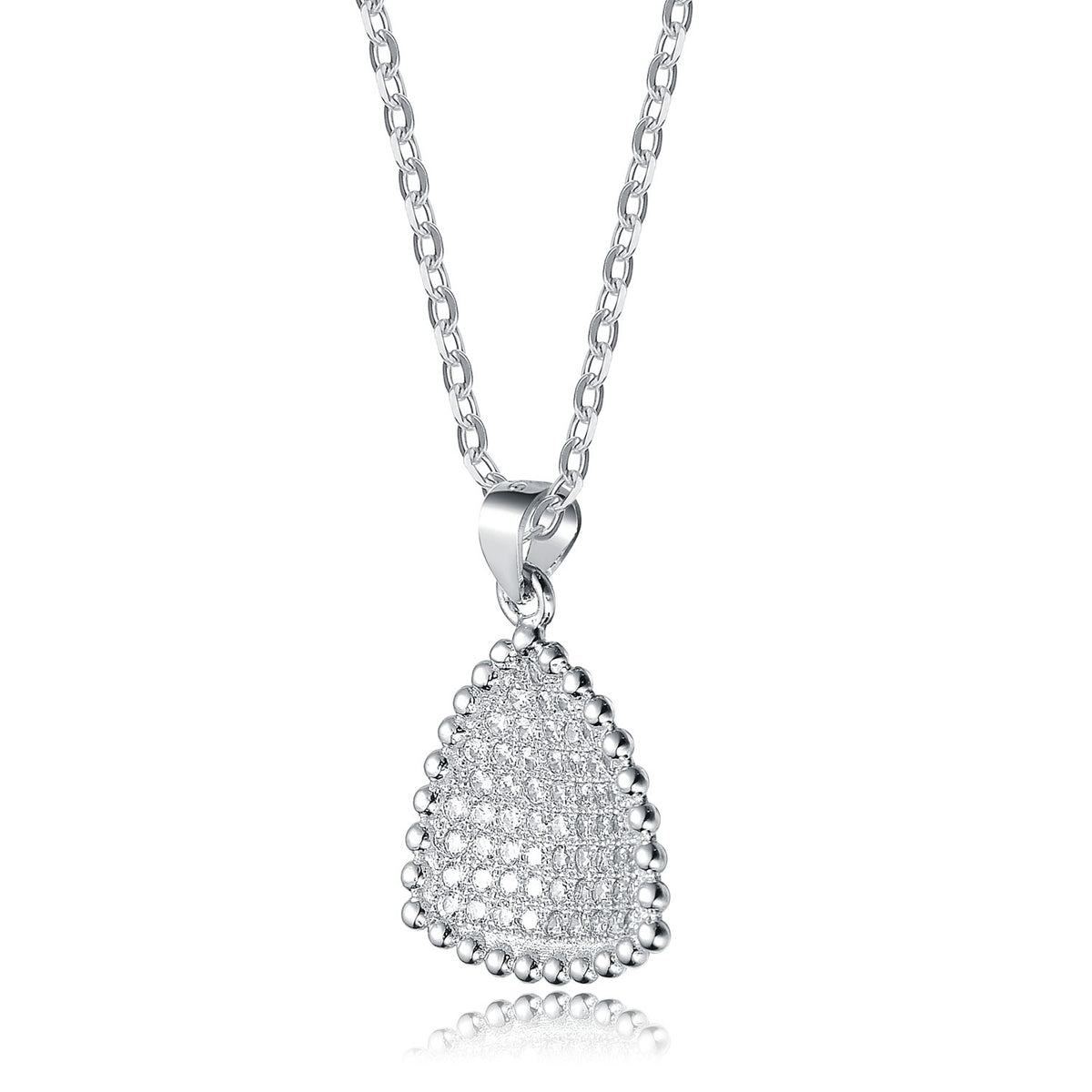 This pendant is made of sterling silver and features a triangular-shaped cubic zirconia stone.