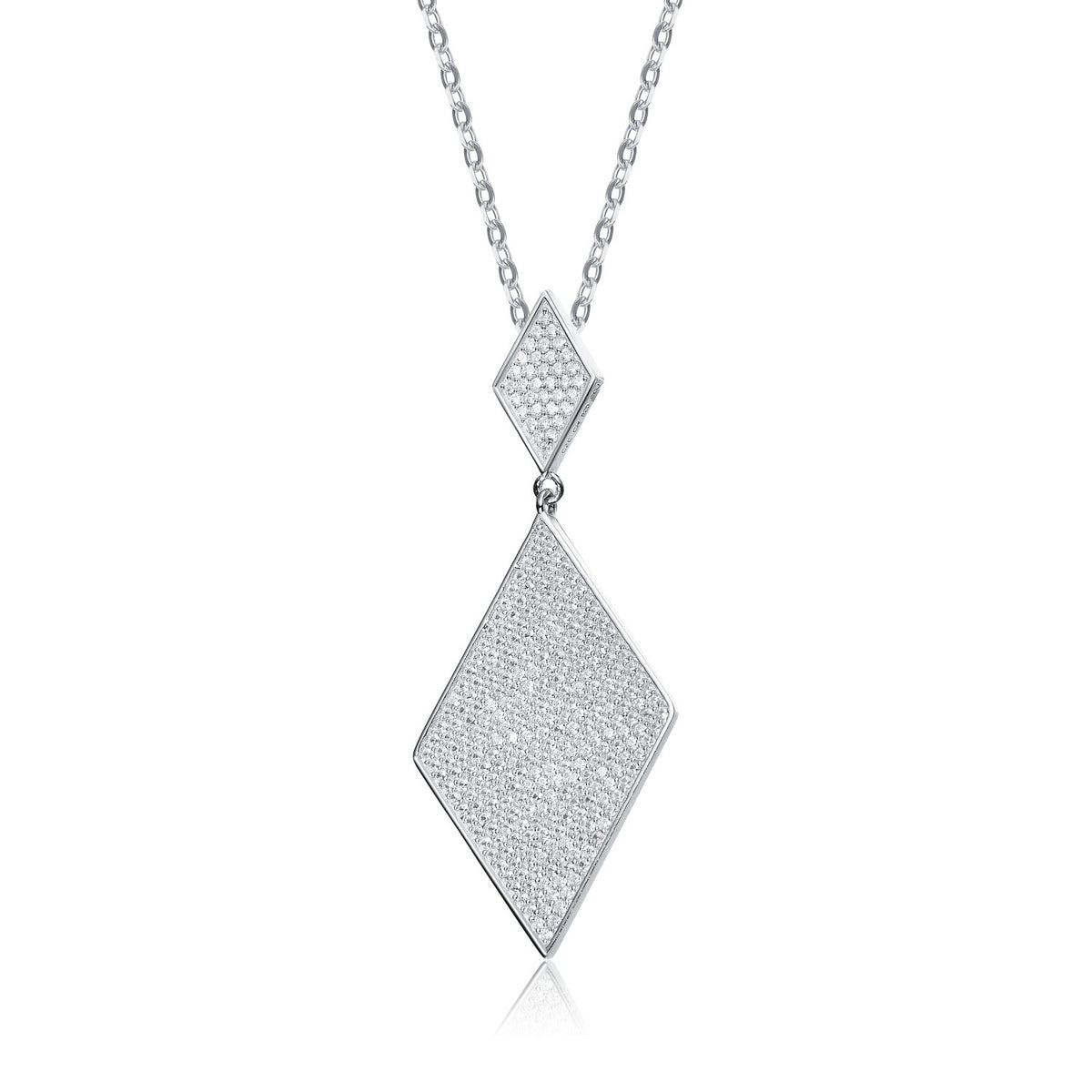 The Sterling Silver Rhodium Plated White Cubic Zirconia Two Connected Diamond-Shaped Figures Pendant by Genevive Jewelry is a beautiful and intricate design. It features white cubic zirconia stones within a frame of rhodium plated sterling silver. The pendant consists of two connected diamond-shaped figures, giving it a textured and elegant appearance.