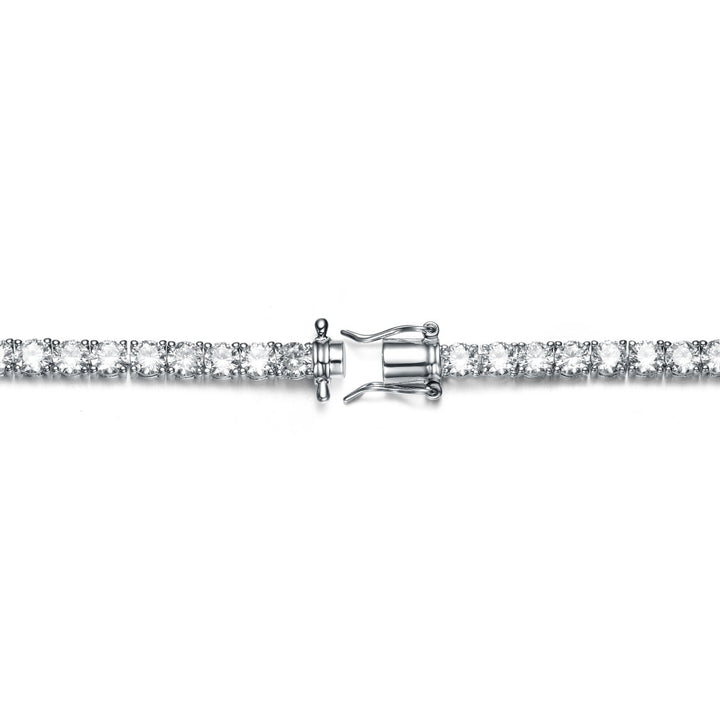 This tennis bracelet is made of white gold plating and features a row of sparkling cubic zirconia stones. It has a magnetic lock clasp.
