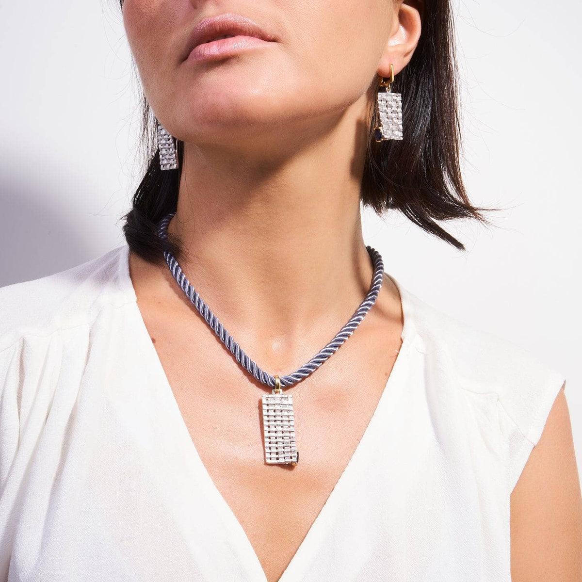 This Accalia Sapphire Pendant by German Kabirski is a bold and dramatic piece. The pendant has been handcrafted in white rhodium and gold and is encrusted with pretty blue sapphire gemstones. The combination of heavenly blue sapphires and precious metals creates a stunning and elegant look. This pendant is part of a set with the Accalia Ring and Earrings, creating a look of visual perfection.