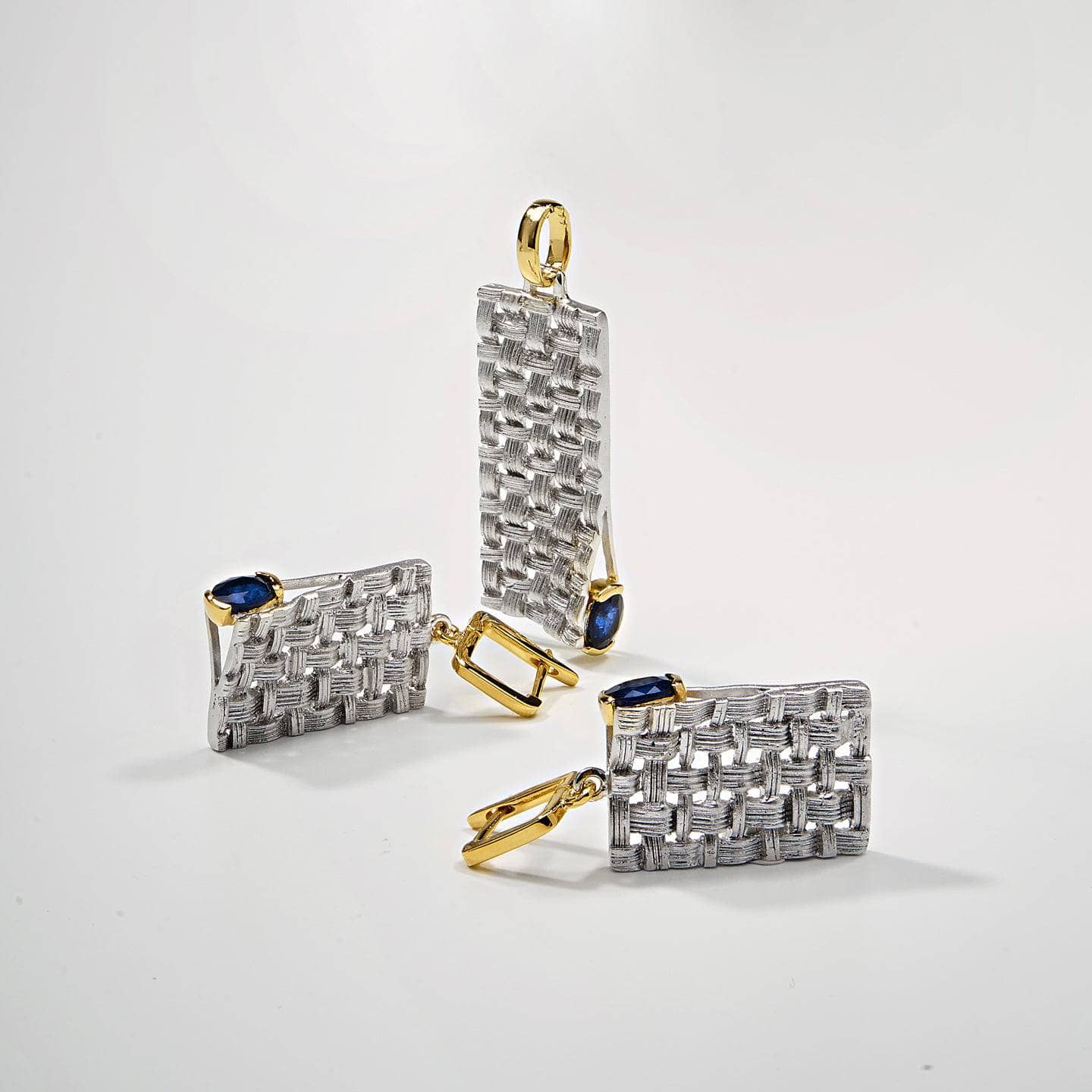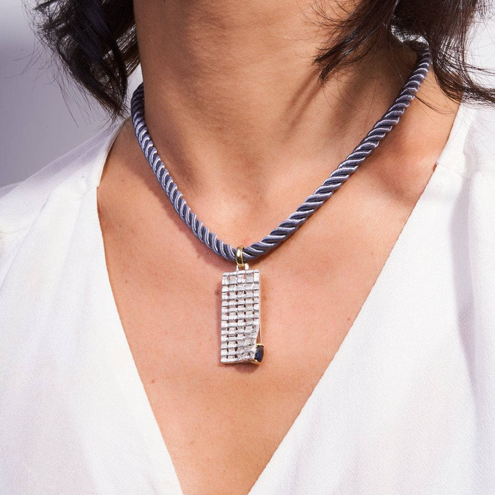 This handmade pendant is crafted from 925 Silver with White Rhodium and 18K Gold plating. It is encrusted with sapphire stones.