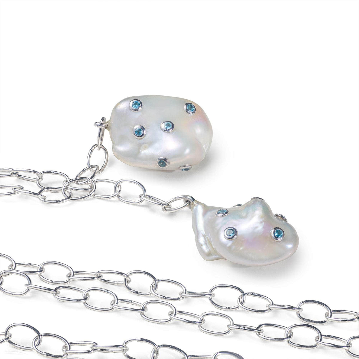 This piece is crafted from 925 silver with white rhodium plating. It features baroque pearls and London blue topaz stones.