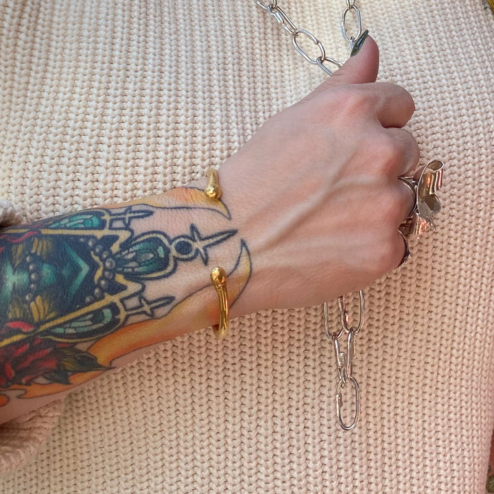 This cuff is made of solid 6-gauge sterling silver in 18k yellow gold vermeil. It is available in small, medium, and large sizes.
