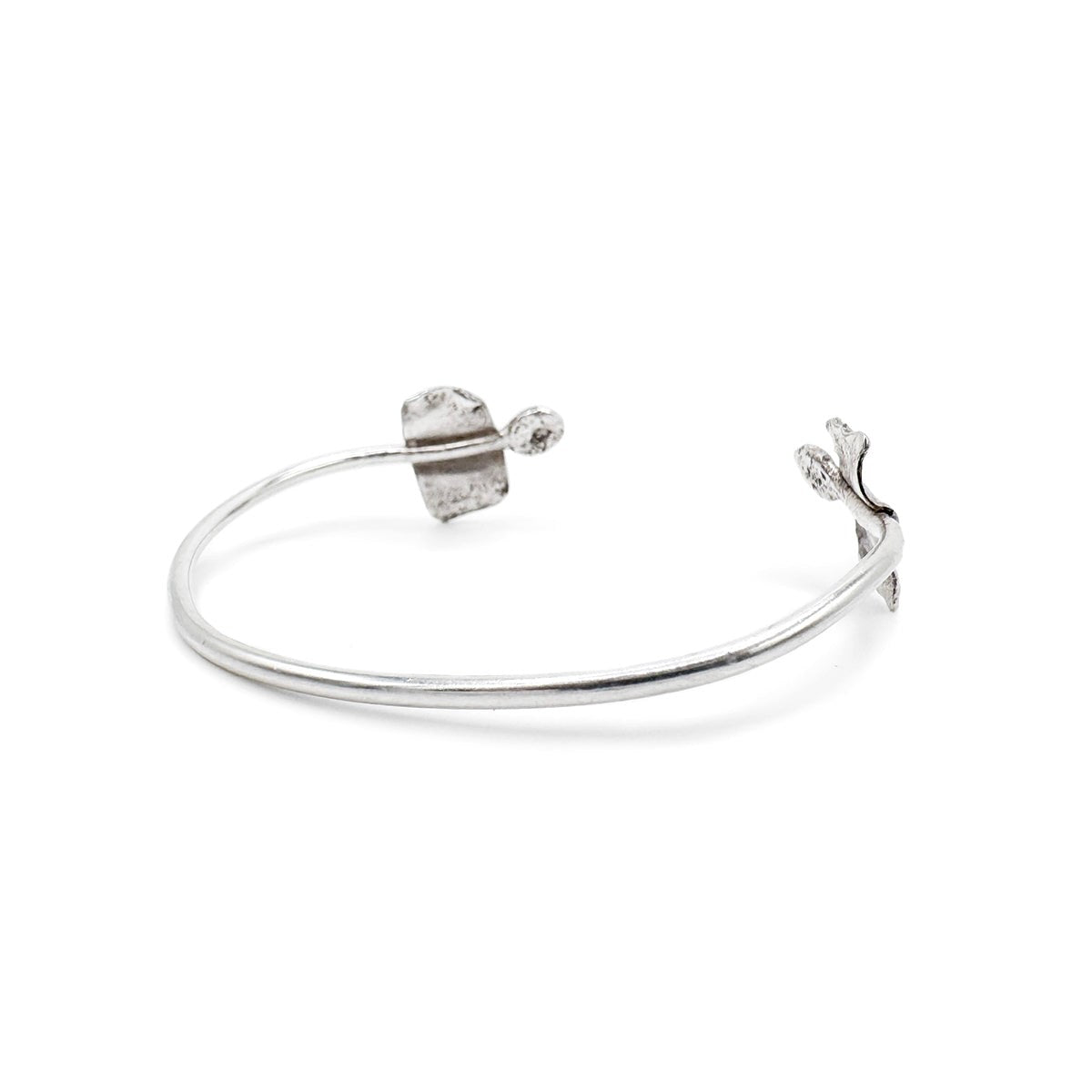This cuff is a hand-sculpted piece made from 12-gauge sterling silver. An 18k yellow gold vermeil option is also available.