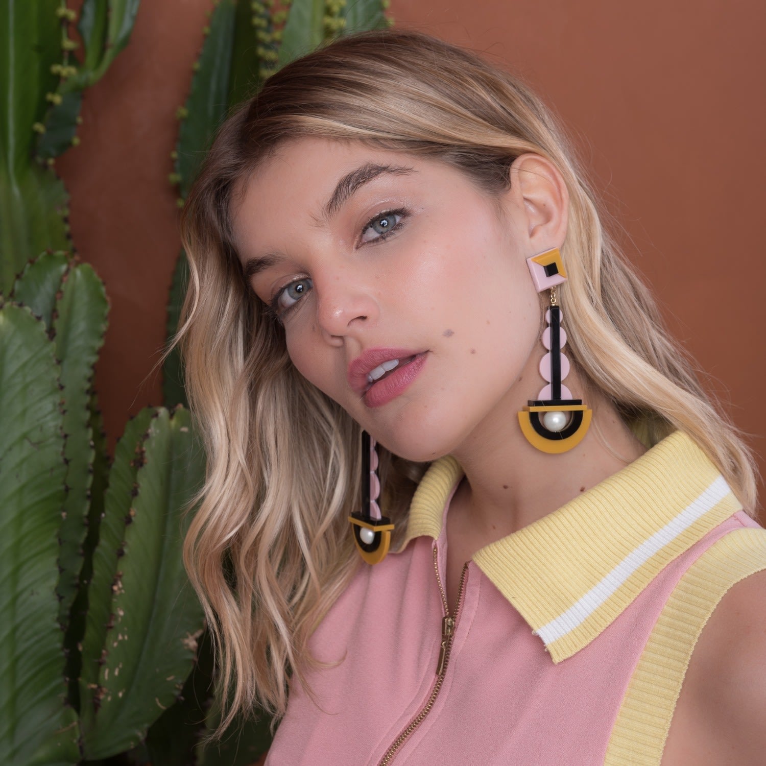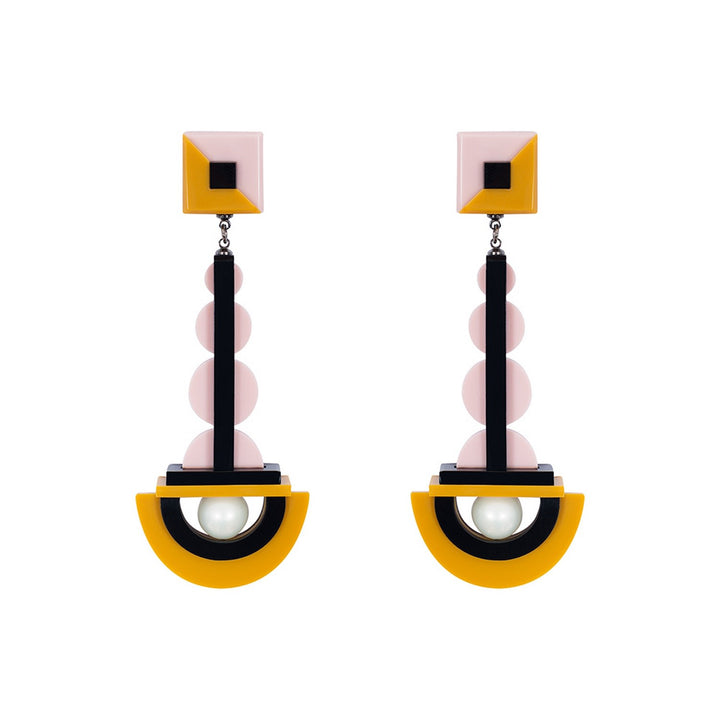 These Acrylic Handmade Earring Drops Mustard by Gissa Bicalho are a unique and stylish accessory. These handmade earrings combine mustard, pink, and black tones with a shell pearl and a golden finish on the metals. They are a perfect accessory for those who want to stand out from the crowd.