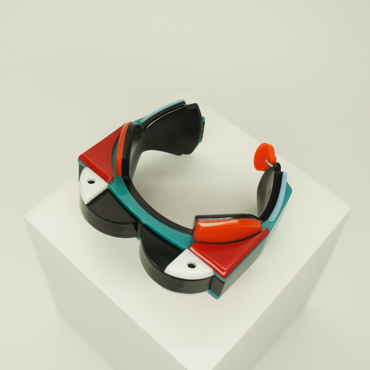 This Handmade Acrylic Bracelet Toucans Orange by Gissa Bicalho is a beautiful and artistic representation of an exotic tropical bird. The stylized and geometric design brings a modern and sophisticated feel, making it a unique and playful accessory. Handmade with love in Brazil, this bracelet is a perfect statement piece that showcases your fun and creative spirit.
