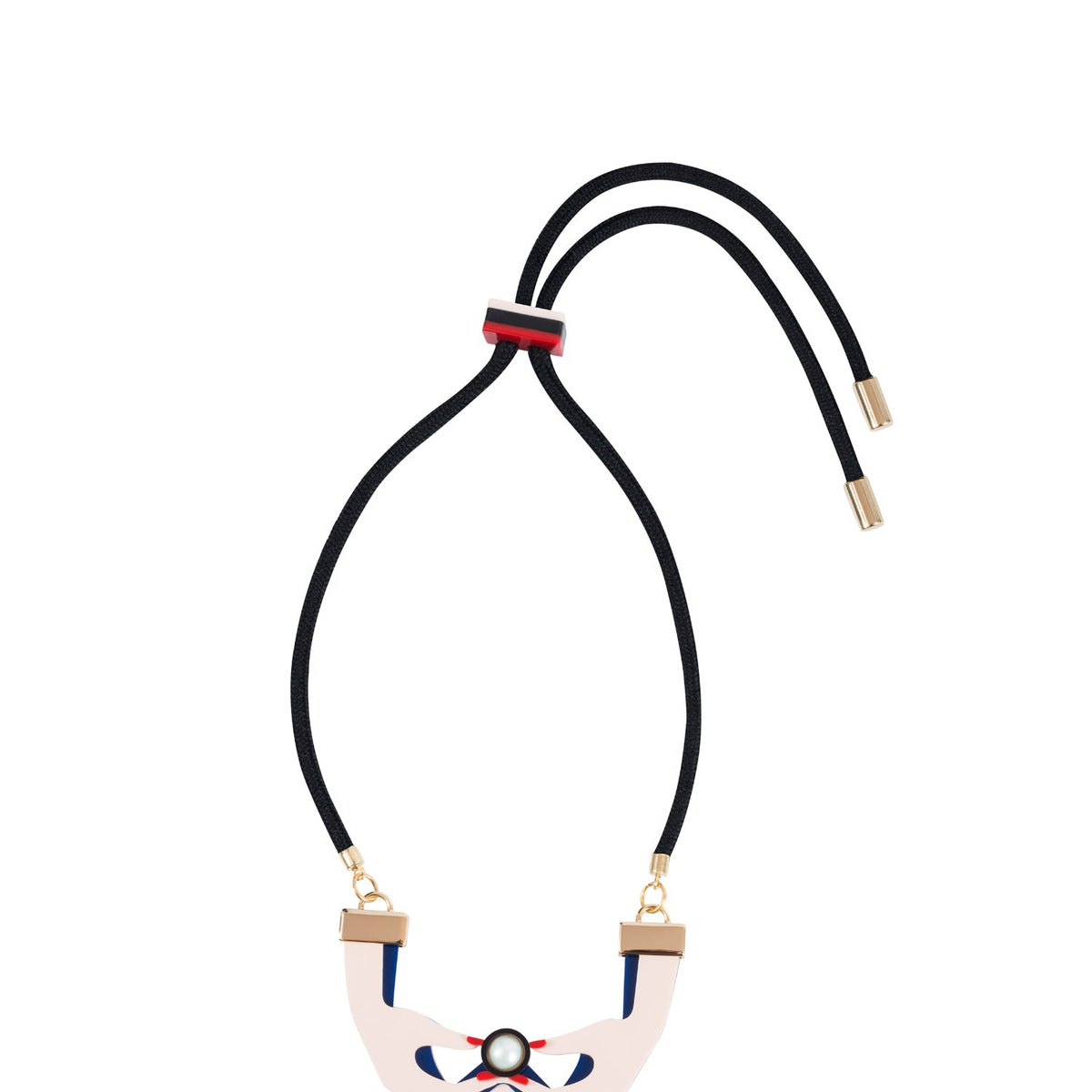 This necklace is handmade from acrylic with pearl and ribbon details.