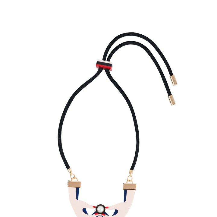 This Acrylic Handmade Necklace Long Hands by Gissa Bicalho is a charming and surreal accessory. The "Long Hands" design, with its softness of pearl and ribbon, is perfect for updating your outfit and giving it a very charming appearance. Handmade with love in Brazil, this necklace is a unique and artistic statement piece.