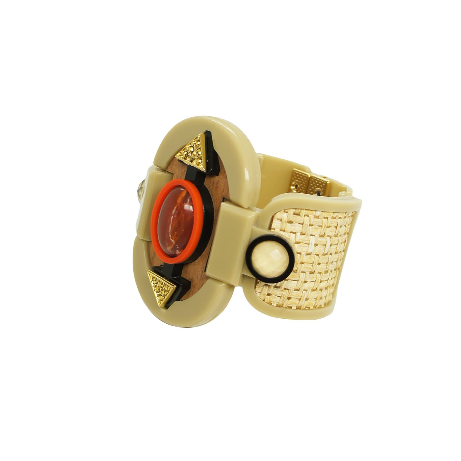 This handmade bracelet is crafted from acrylic, wood, straw, and metal.