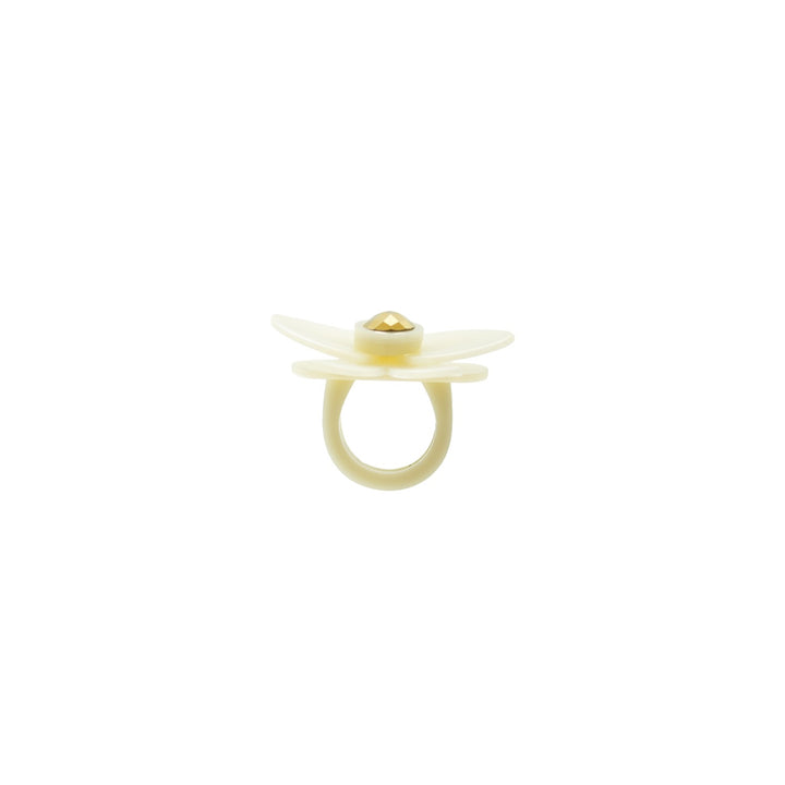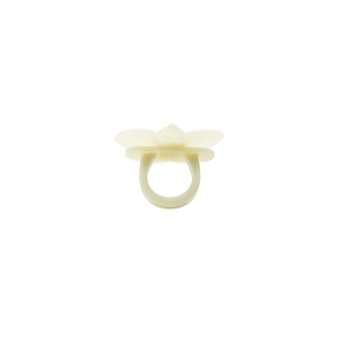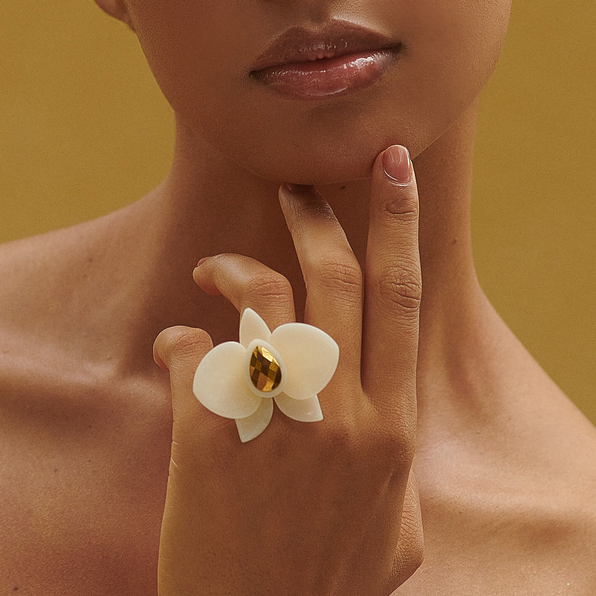 This Acrylic Handmade Ring Orchid Cream by Gissa Bicalho is a unique and artistic accessory. This ring, made of cream-colored acrylic, features a mirrored glass stone application that adds a touch of modern flair. Handcrafted by Brazilian artisans, it's a bold and stylish statement piece.