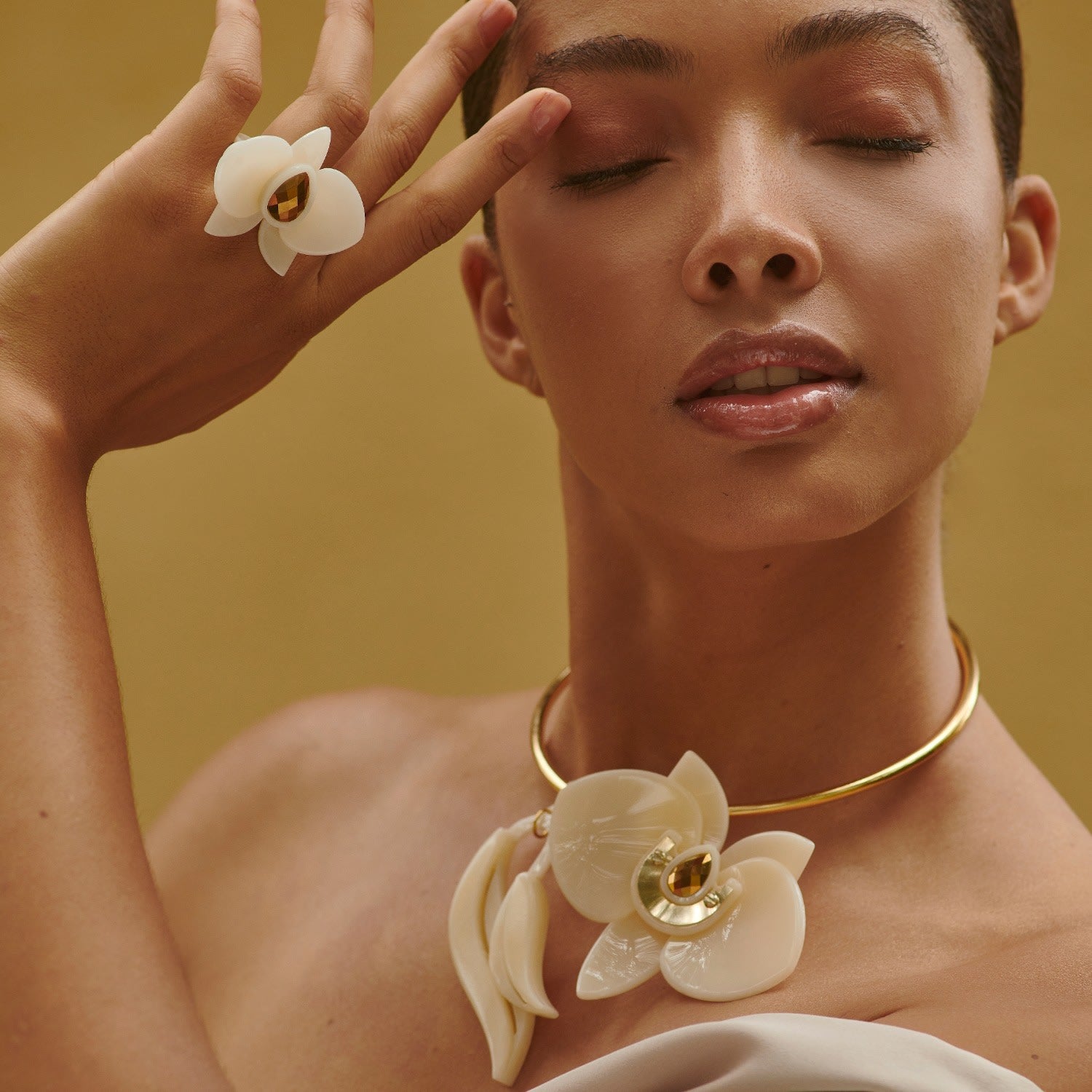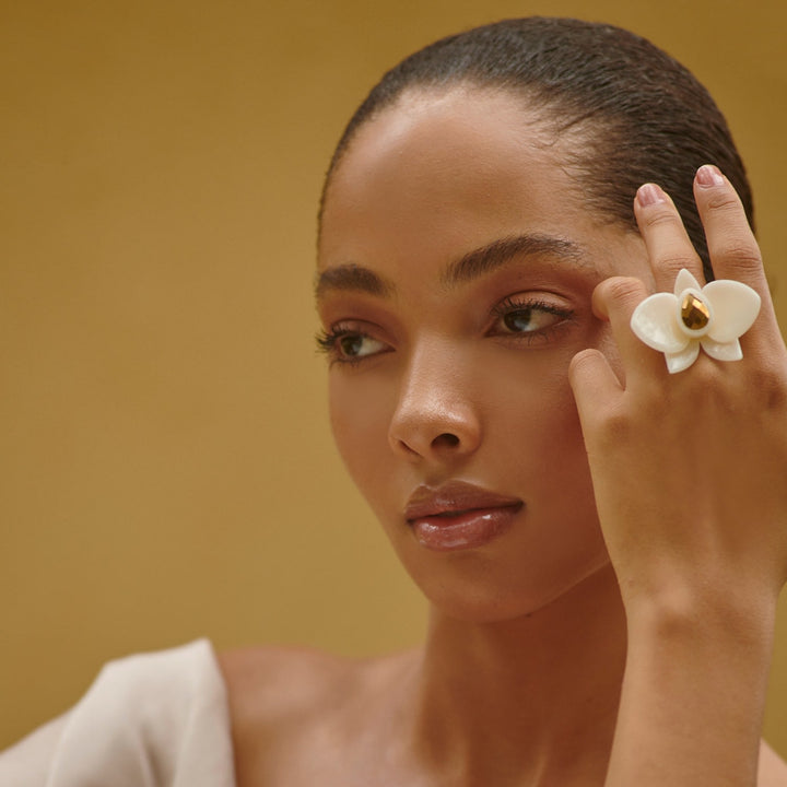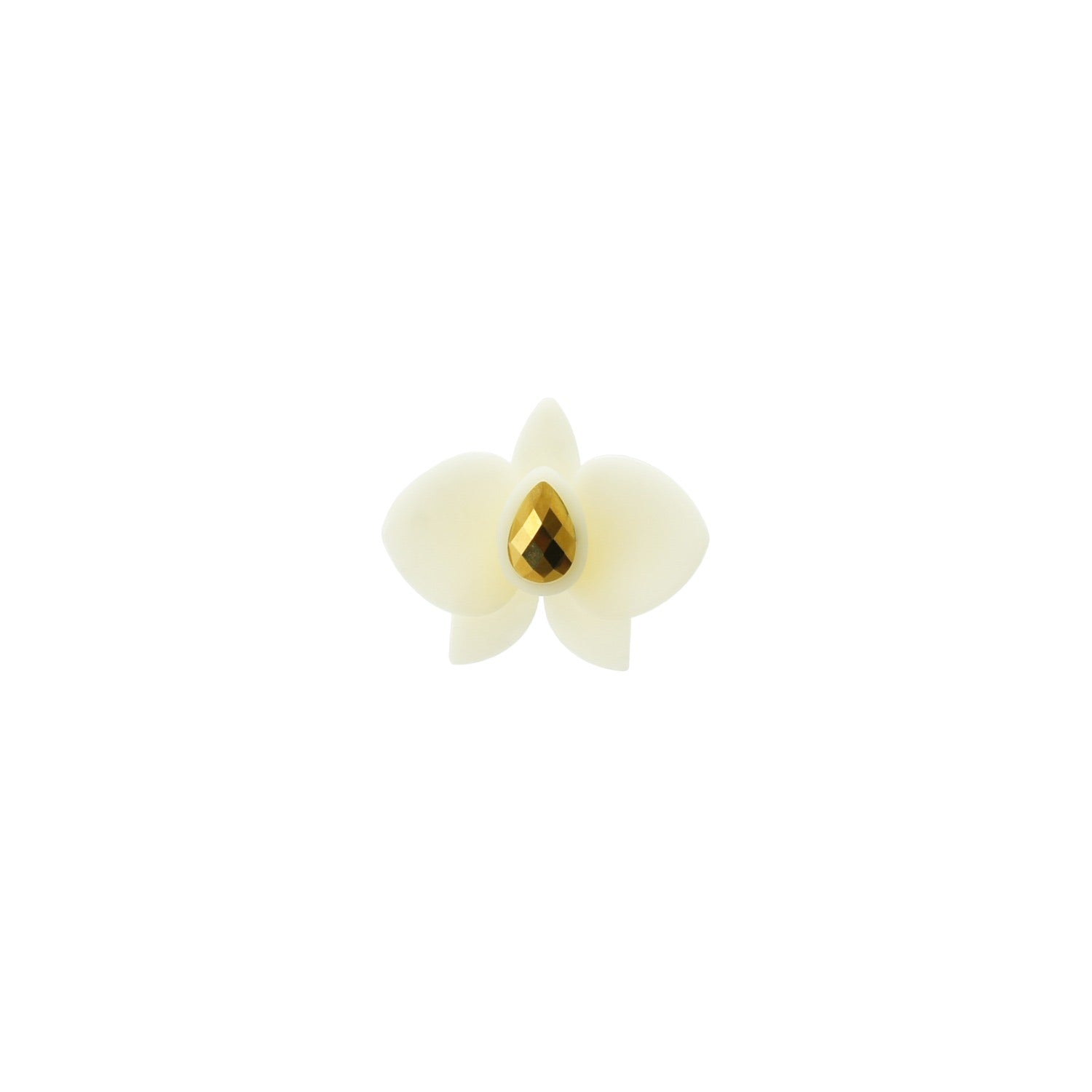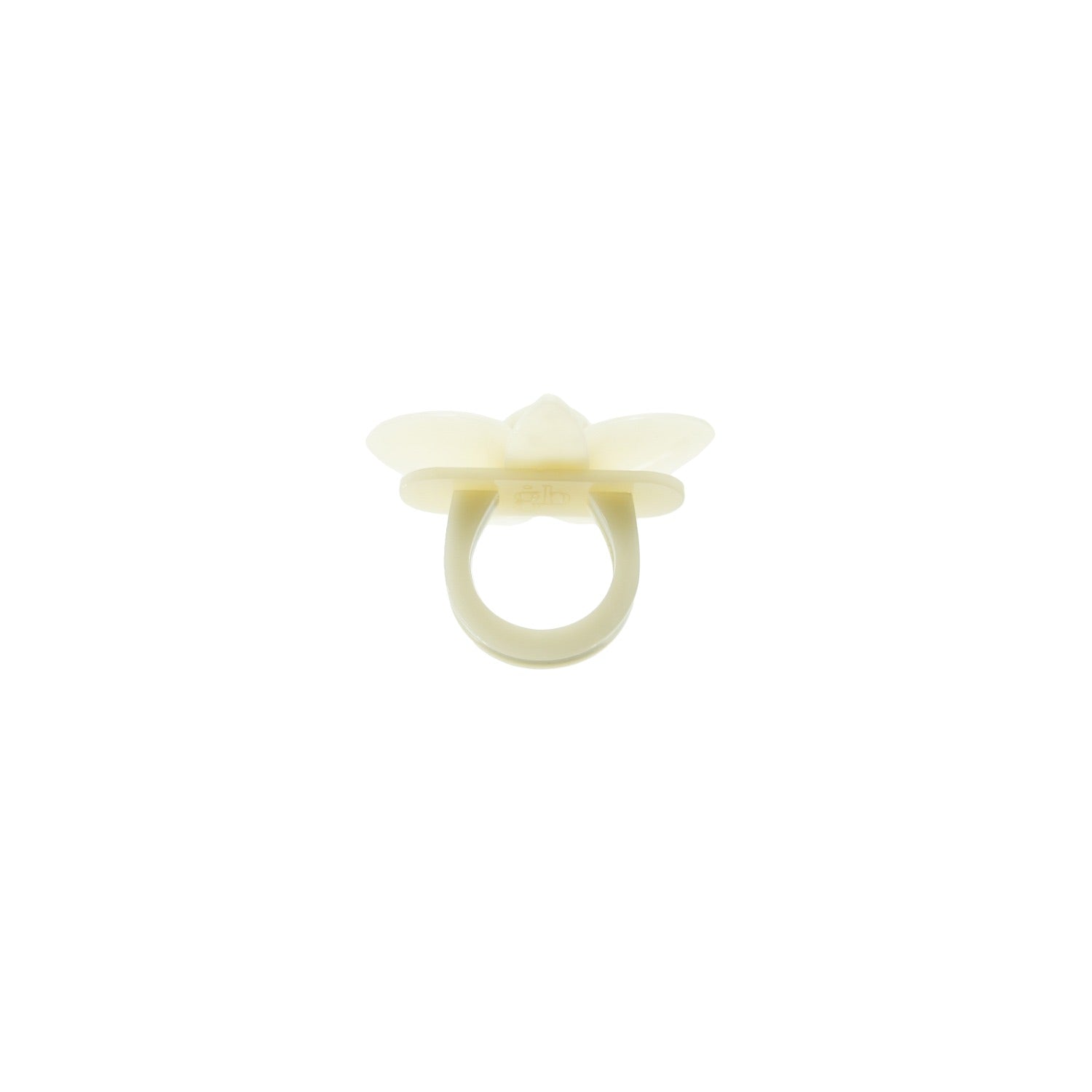 This Acrylic Handmade Ring Orchid Cream by Gissa Bicalho is a unique and artistic accessory. This ring, made of cream-colored acrylic, features a mirrored glass stone application that adds a touch of modern flair. Handcrafted by Brazilian artisans, it's a bold and stylish statement piece.