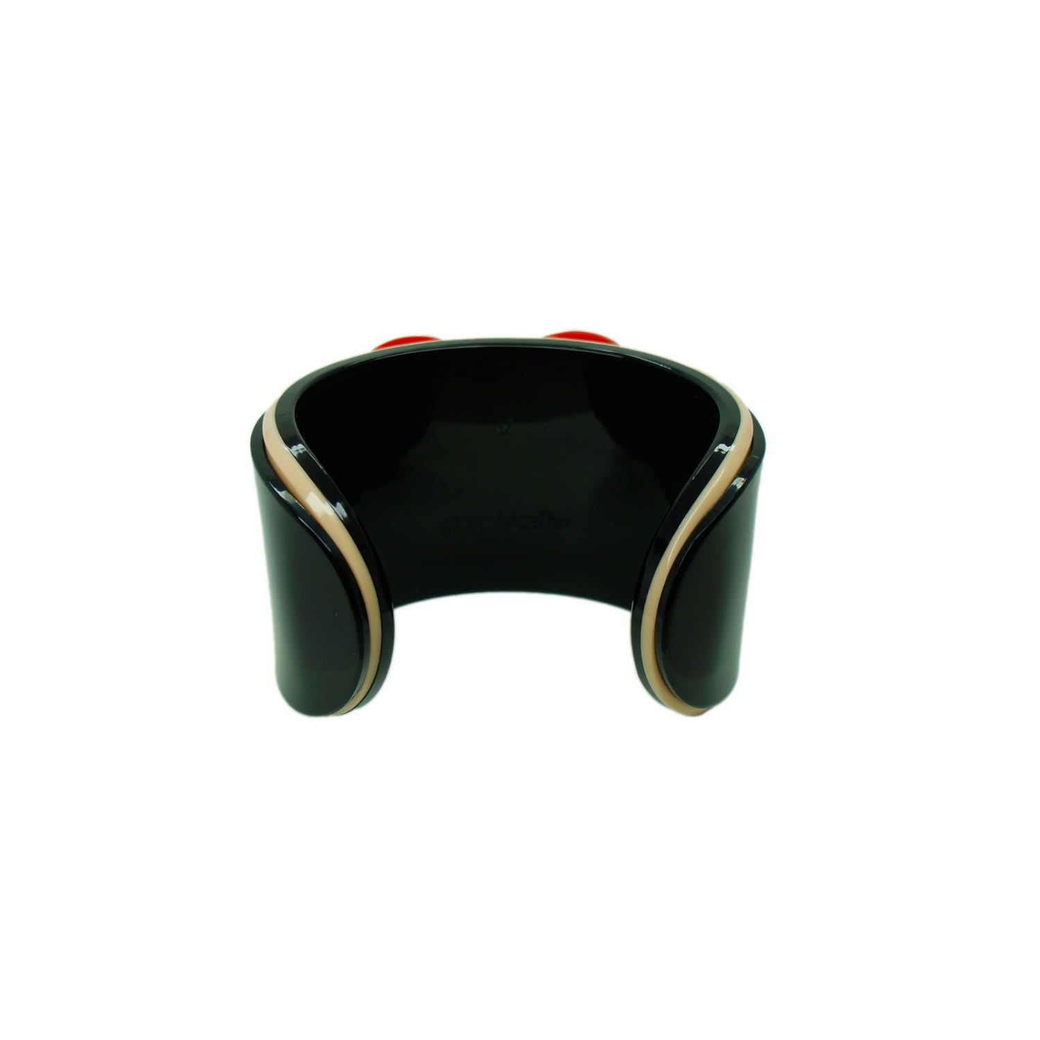 This handmade cuff bracelet is crafted from hand-molded acrylic in black and rose. It is non-adjustable.