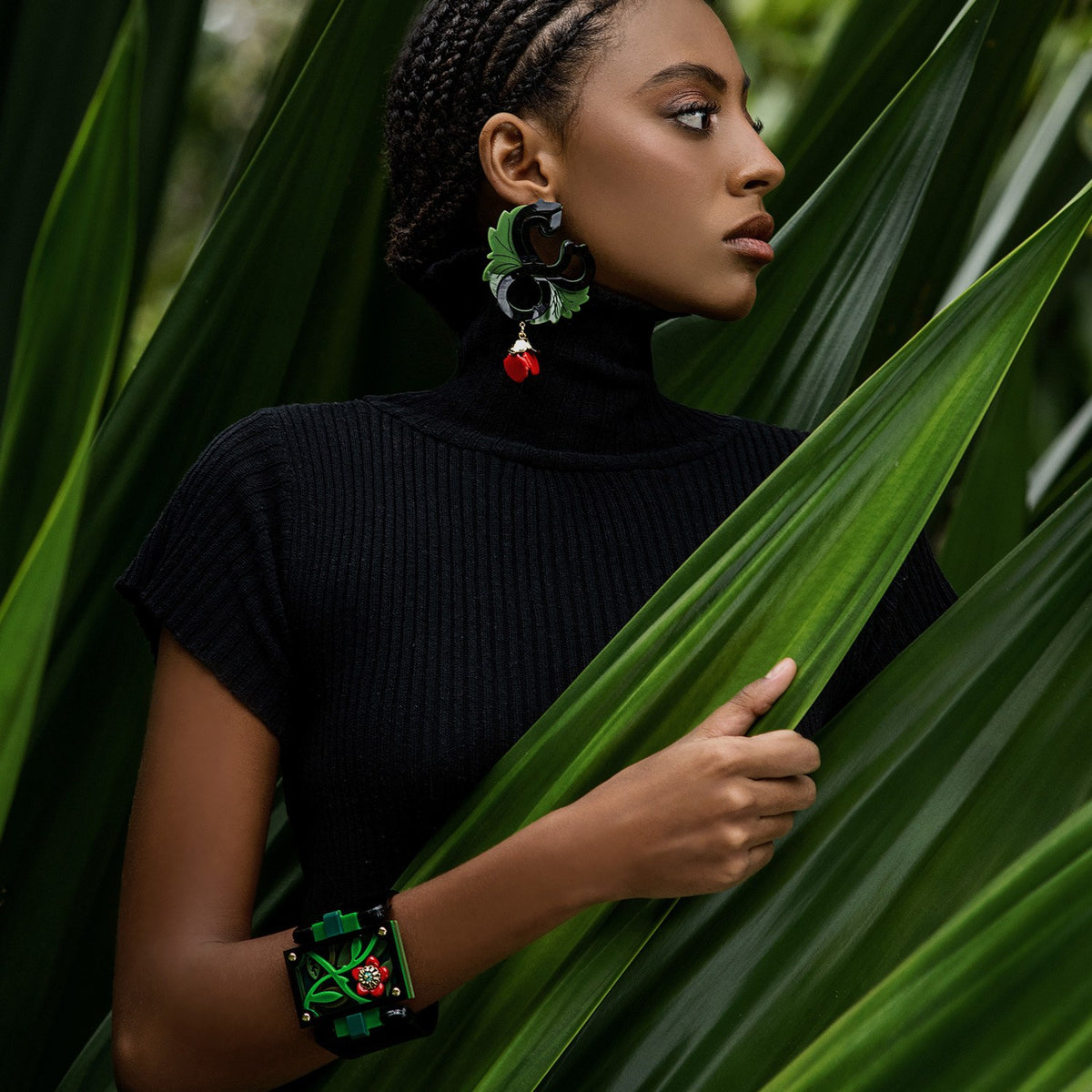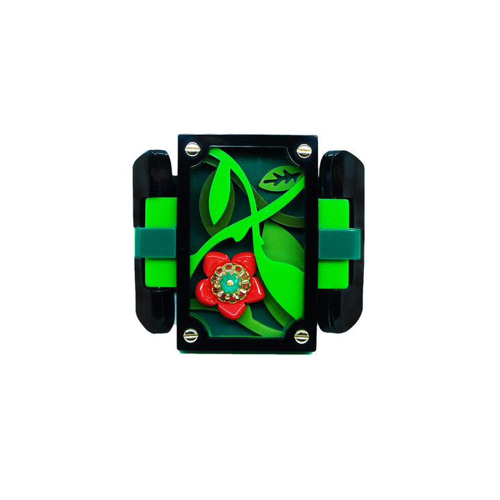 This Acrylic Bracelet Handmade Jungle Black by Gissa Bicalho is a unique and artistic accessory. This handmade acrylic bracelet with glass beads and a gold-finished magnet closure is inspired by the beauty of nature, with flowers, leaves, and volumes. It is a stylish and striking piece.