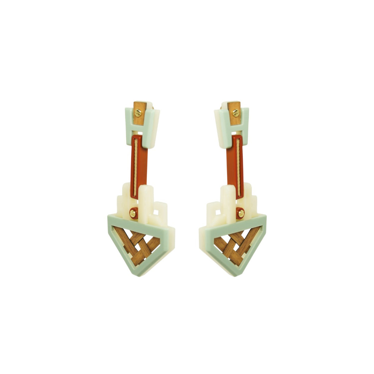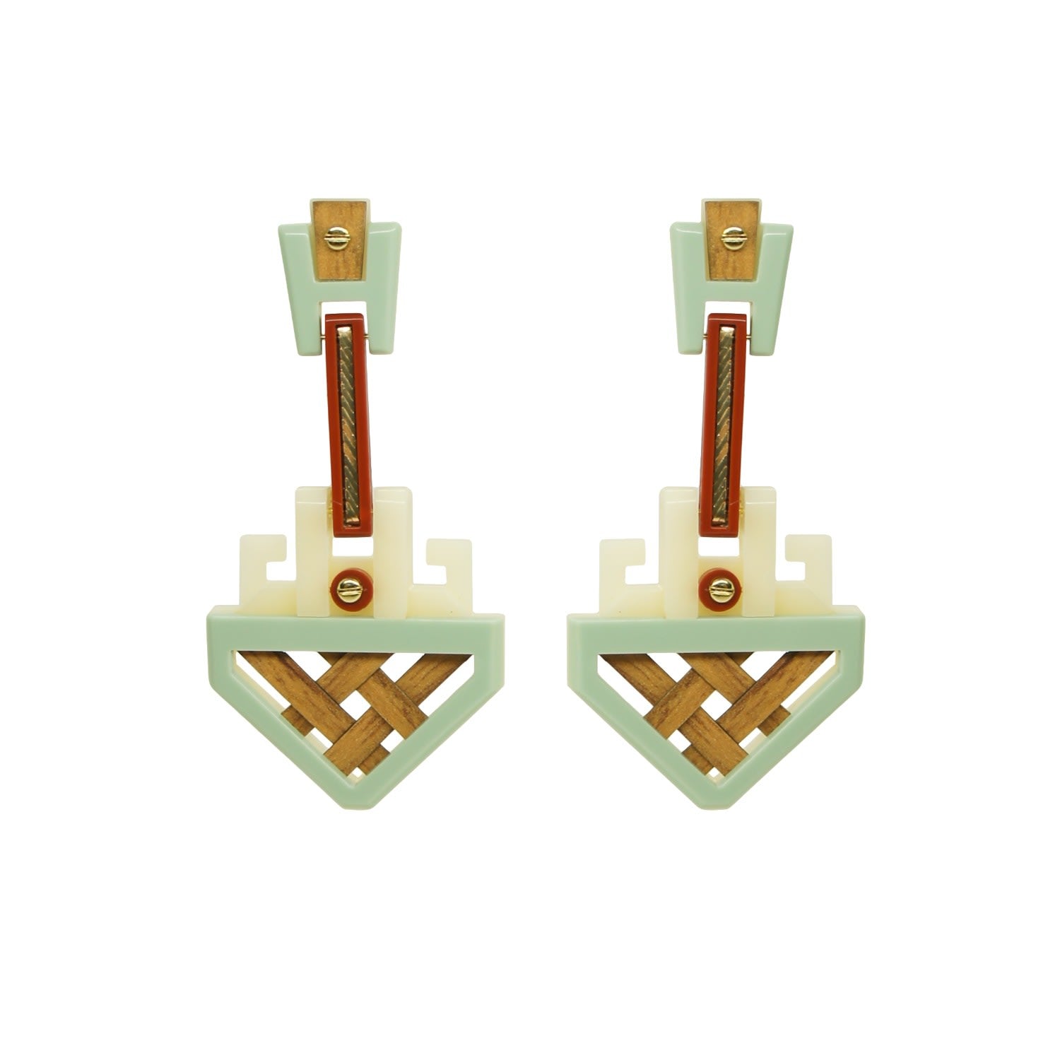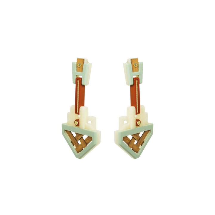 These handmade dangle earrings are crafted from acrylic and feature a Formica application and a gold finish.