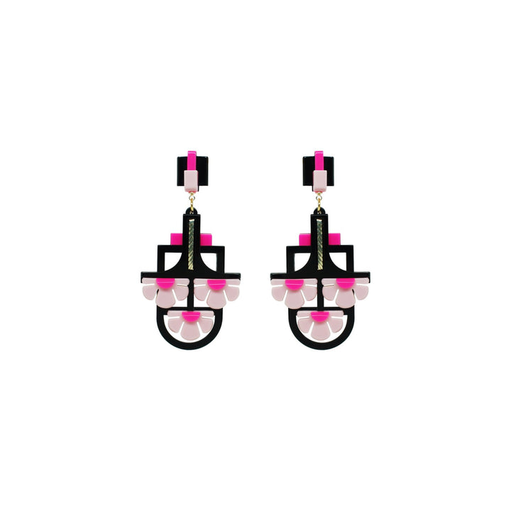 These Handmade Acrylic Earring Pendant Three Flowers Black / Pink by Gissa Bicalho are a unique and artistic accessory. The handmade acrylic earrings have a pendant model with a gold finish. The three-flower design in black and pink makes them a playful and charming statement piece.