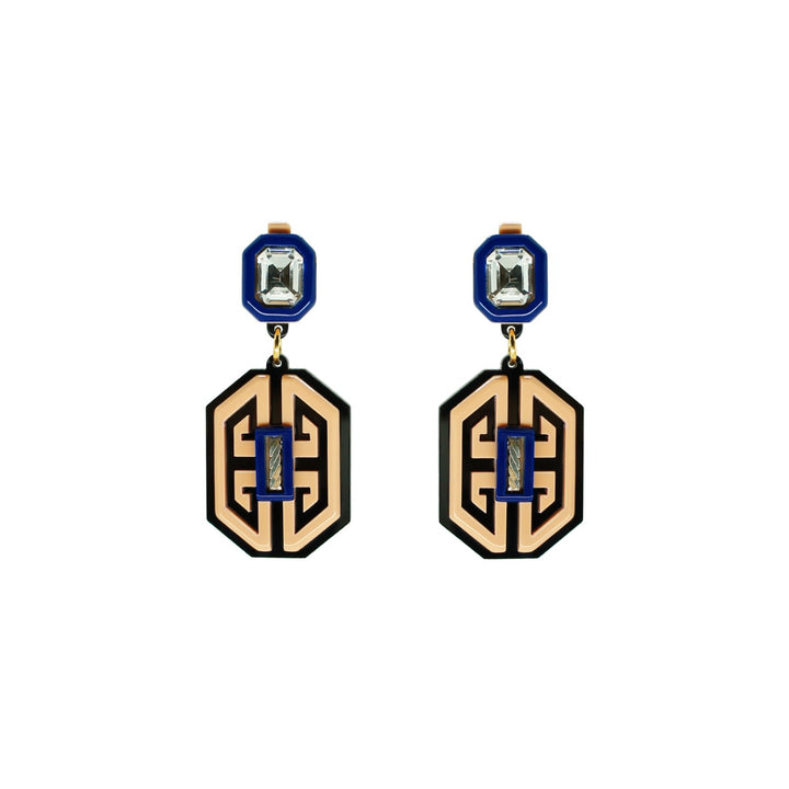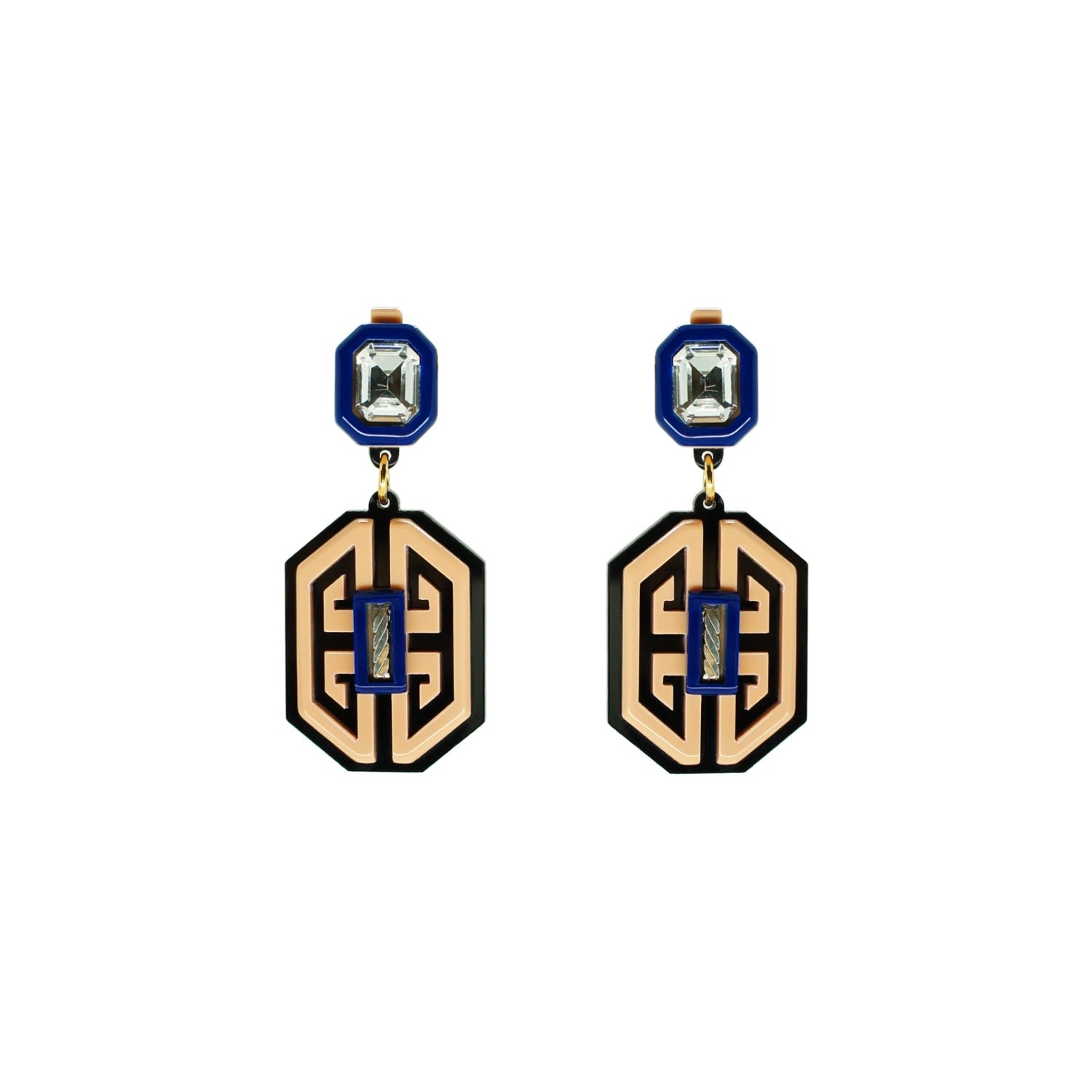 These Acrylic Handmade Earring Meander Rose by Gissa Bicalho are a unique and artistic accessory. The handmade acrylic earrings have a pendant model with a glass stone application and a gold finish. The small variations from the handmade process make each pair one-of-a-kind.