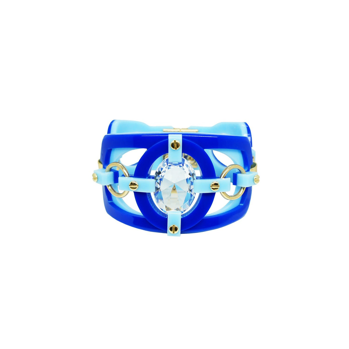 This Handmade Acrylic Bracelet Cutted Stone Oval Blue by Gissa Bicalho is a unique and artistic accessory. This handmade acrylic bangle has an articulated design with a glass stone and gold-finished metals. The small variations from the handmade process make each piece one-of-a-kind.