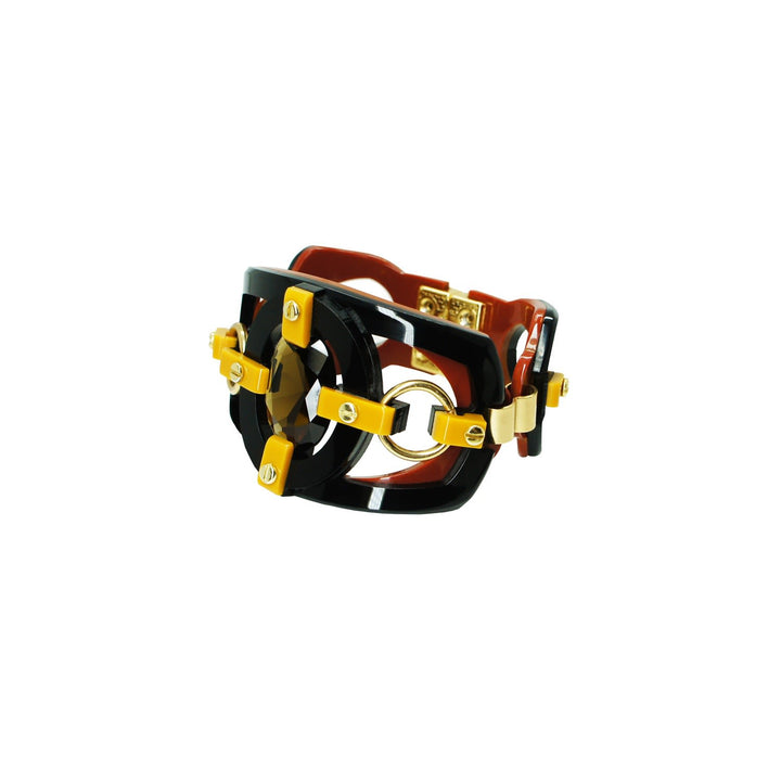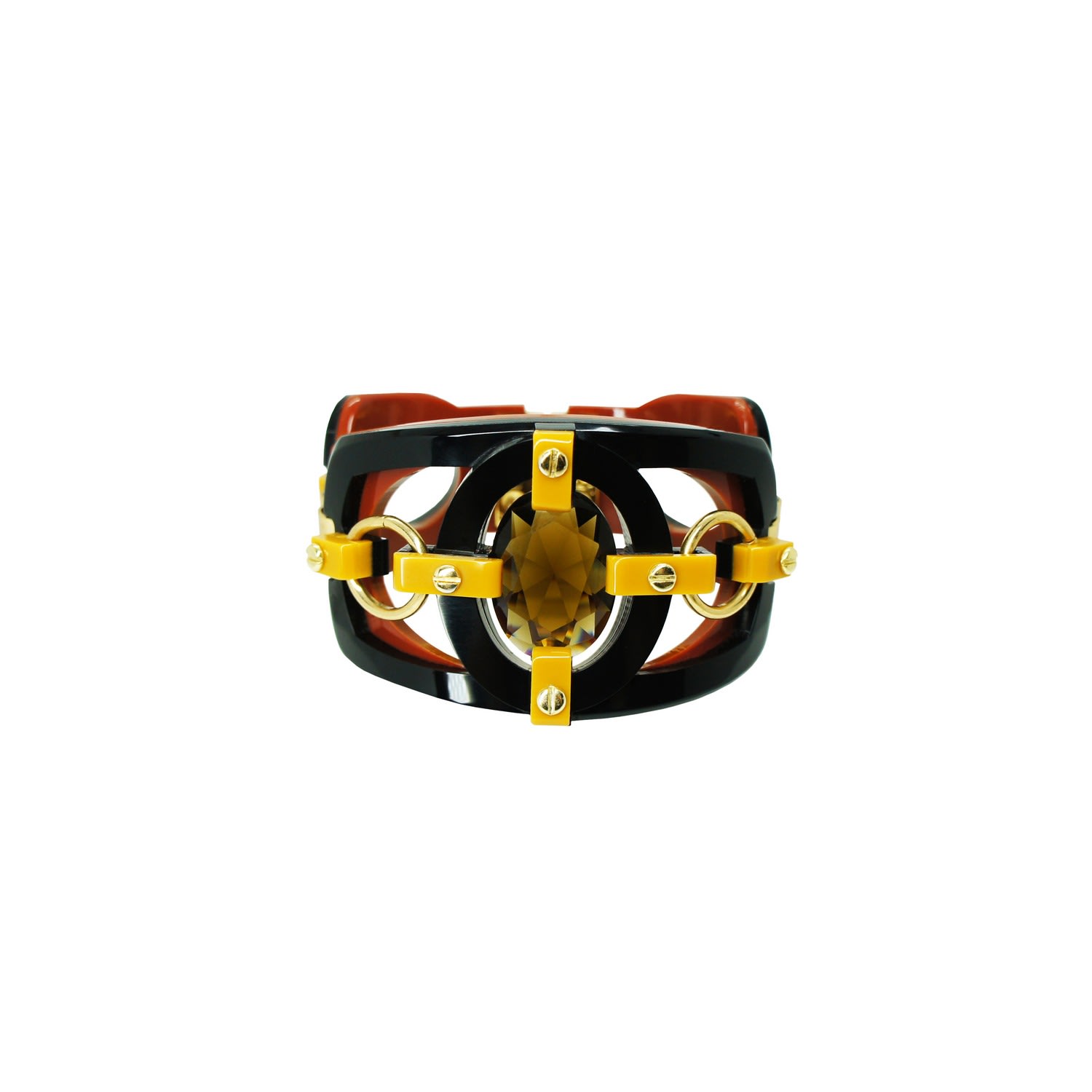 This Handmade Acrylic Bracelet Cutted Stone Oval Mustard by Gissa Bicalho is a unique and artistic accessory. This handmade acrylic bangle has an articulated design with a glass stone and gold-finished metals. The small variations from the handmade process make each piece one-of-a-kind.