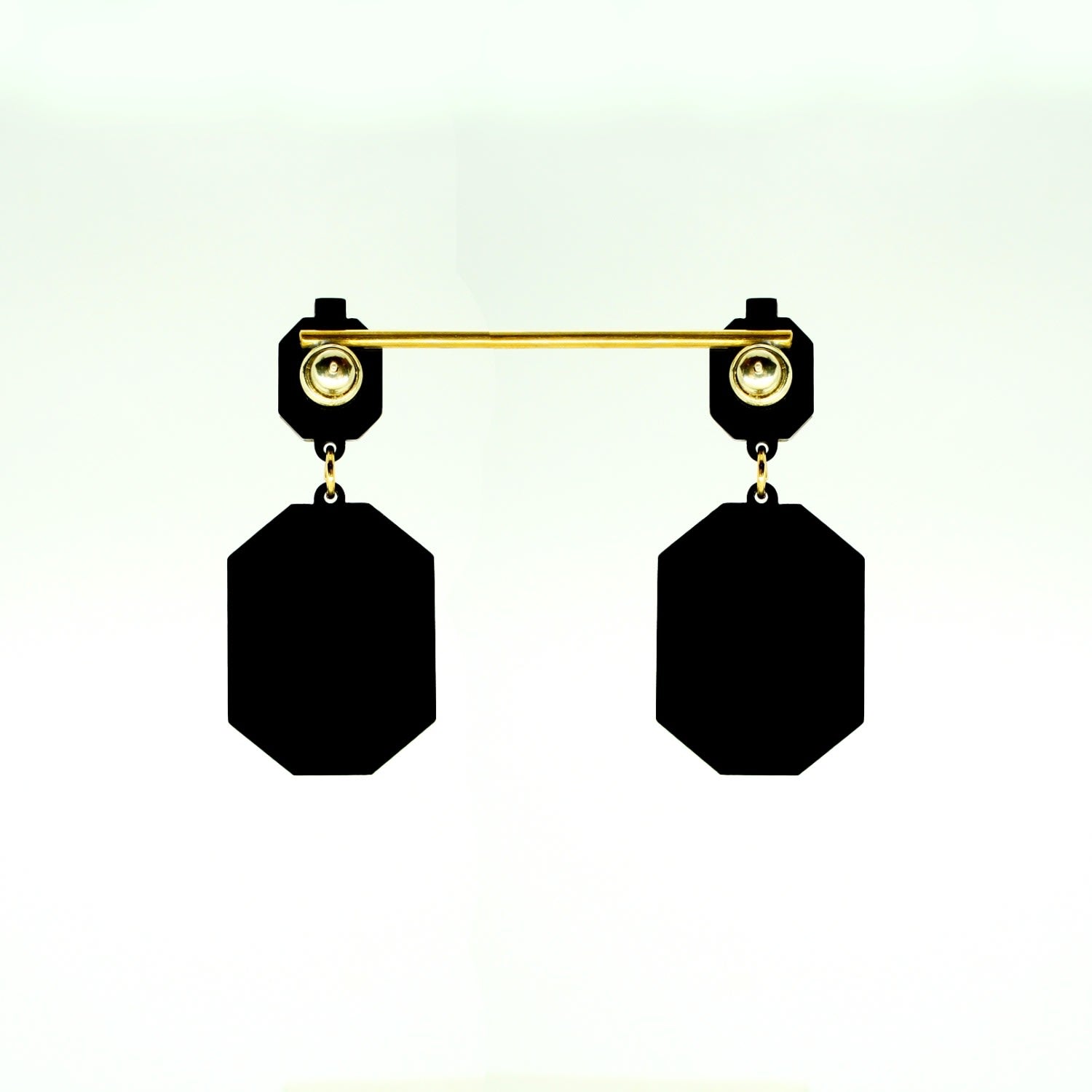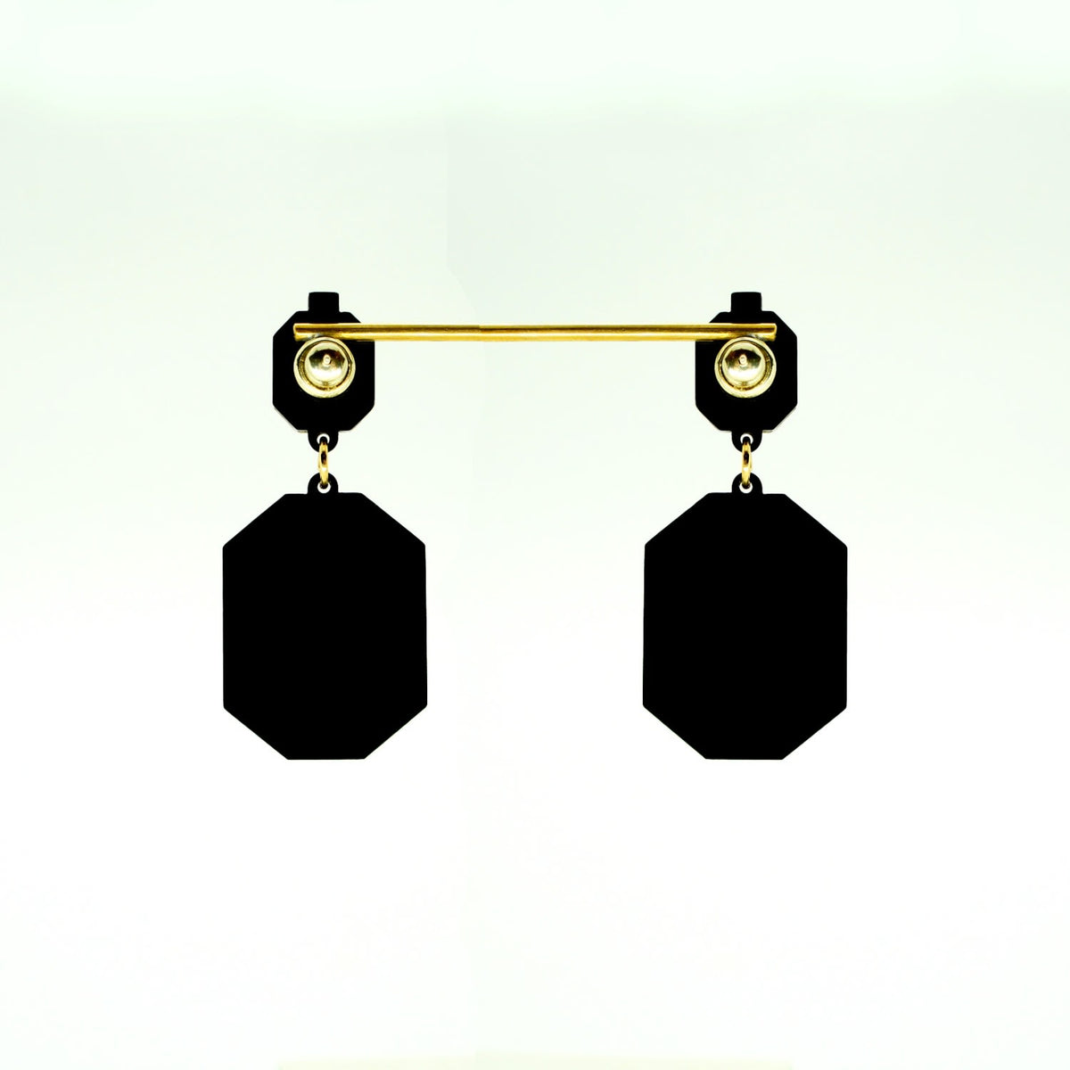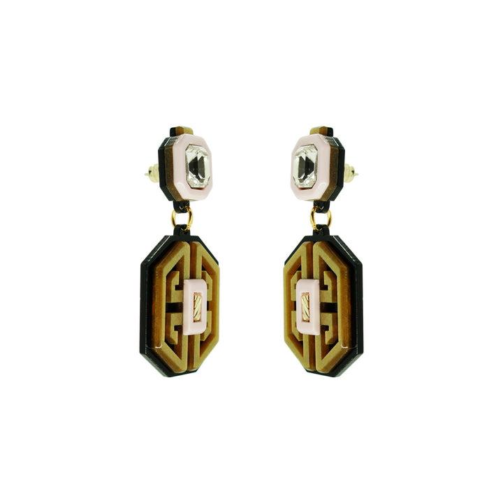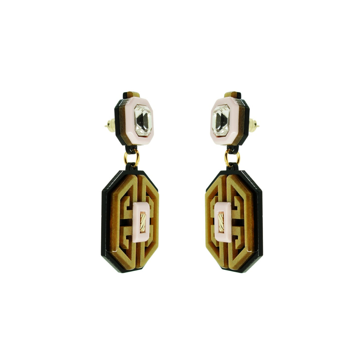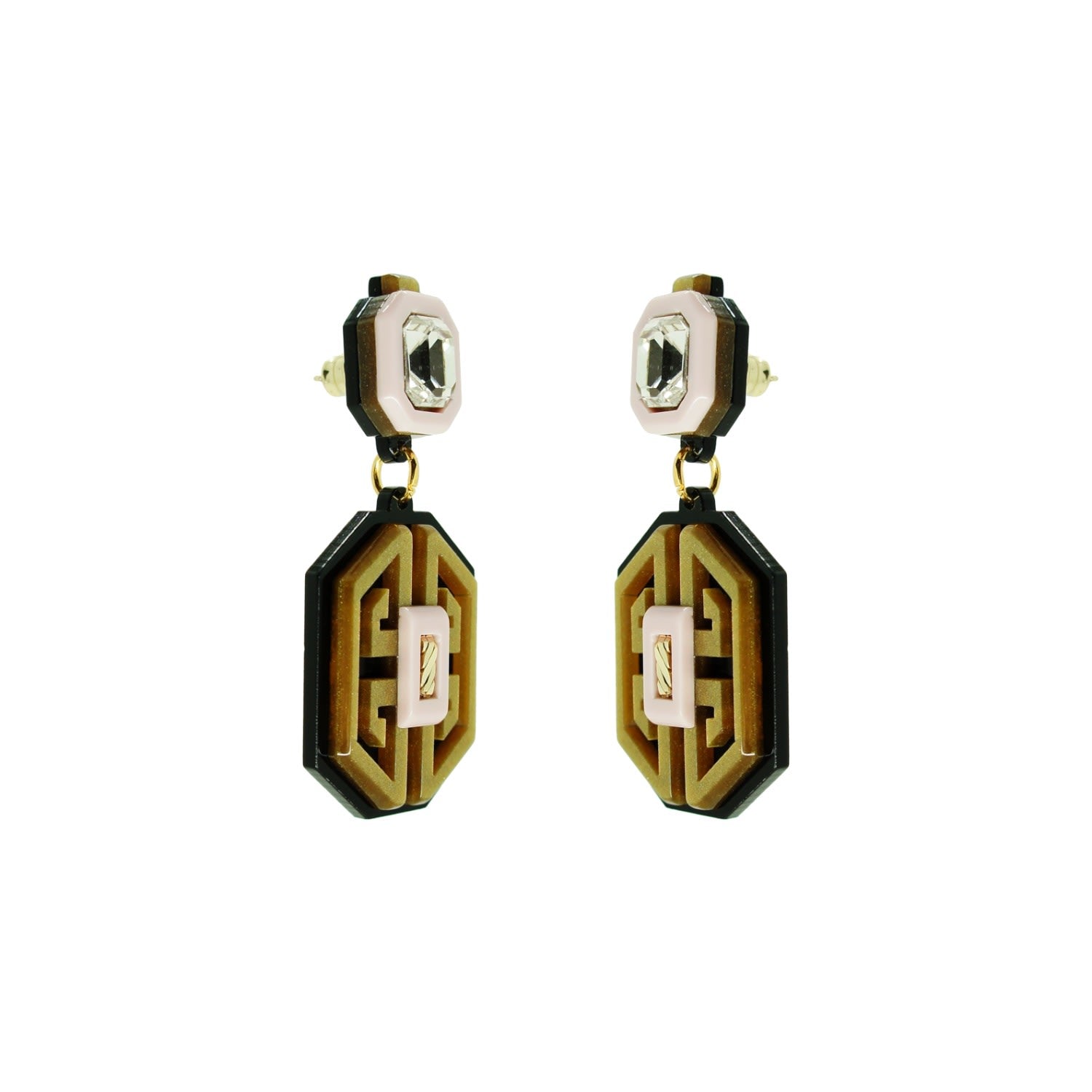 These handmade dangle earrings are crafted from acrylic with a glass stone application and a gold finish.