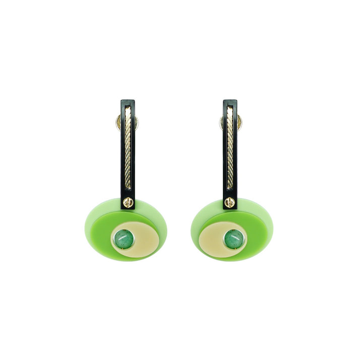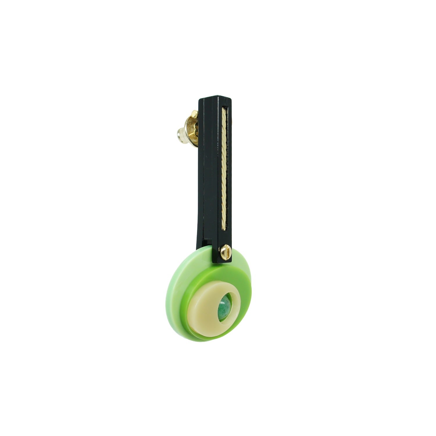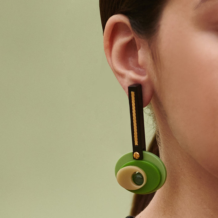 These Acrylic Handmade Earring Orbits Long Green by Gissa Bicalho are a unique and artistic accessory. The handmade acrylic earrings have a chain application, a synthetic bead, and a gold finish. The unique design and color make them a playful and stylish statement piece.