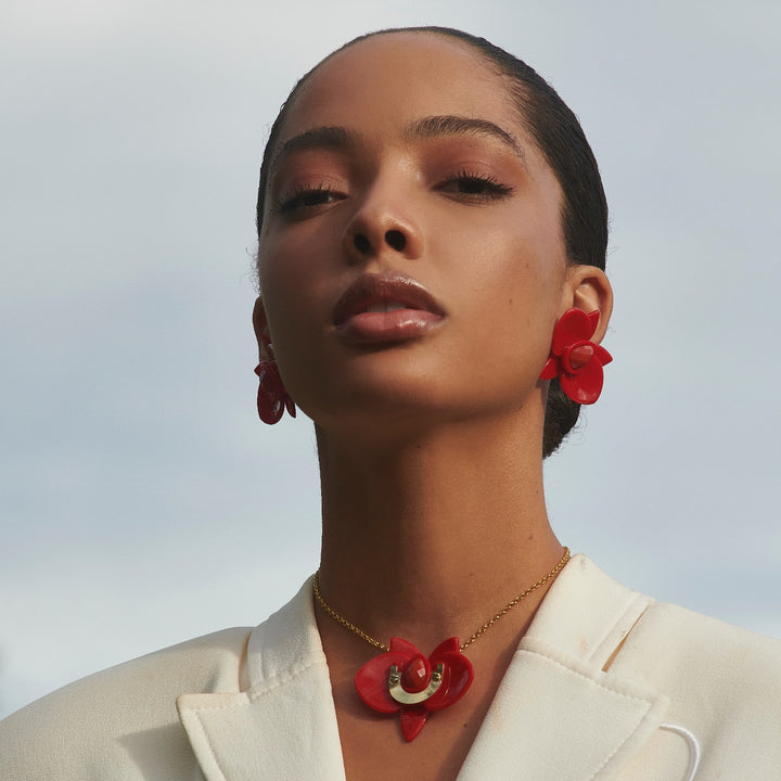 This Handmade Acrylic Necklace Orchid Pendant Red by Gissa Bicalho is a vibrant and artistic piece. The red acrylic orchid pendant, adorned with a mirrored glass stone and a filigree chain, creates a striking and glamorous aesthetic. Its handcrafted nature ensures that each piece is slightly unique, adding a personal and one-of-a-kind touch to your style.