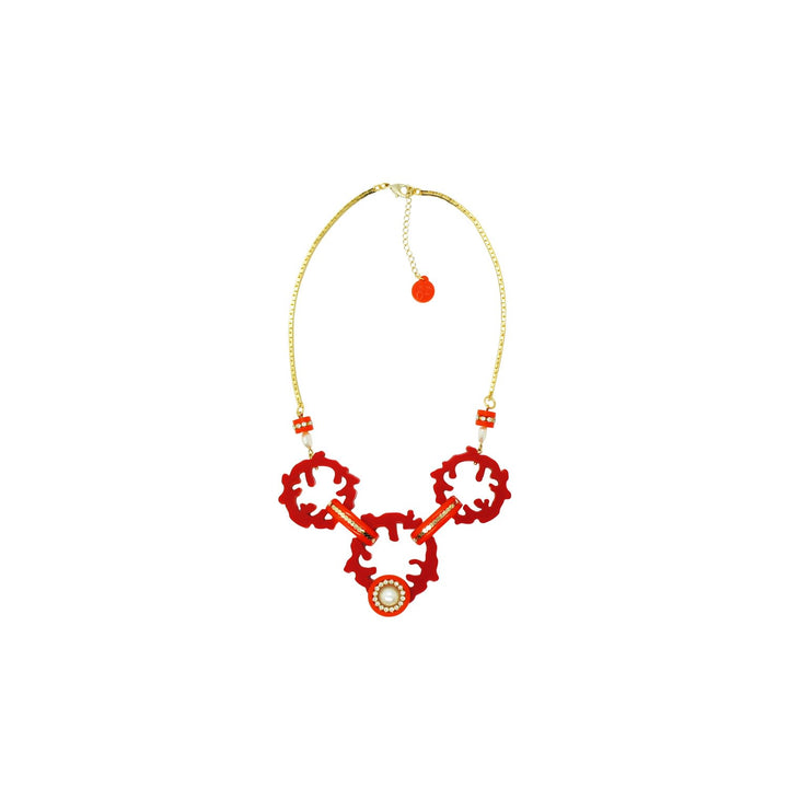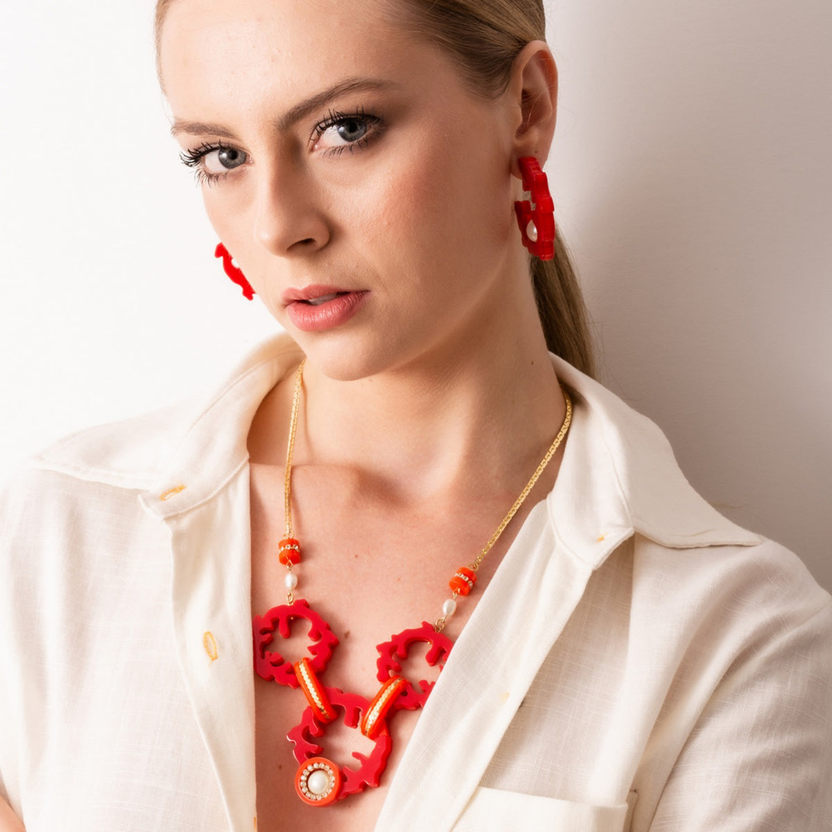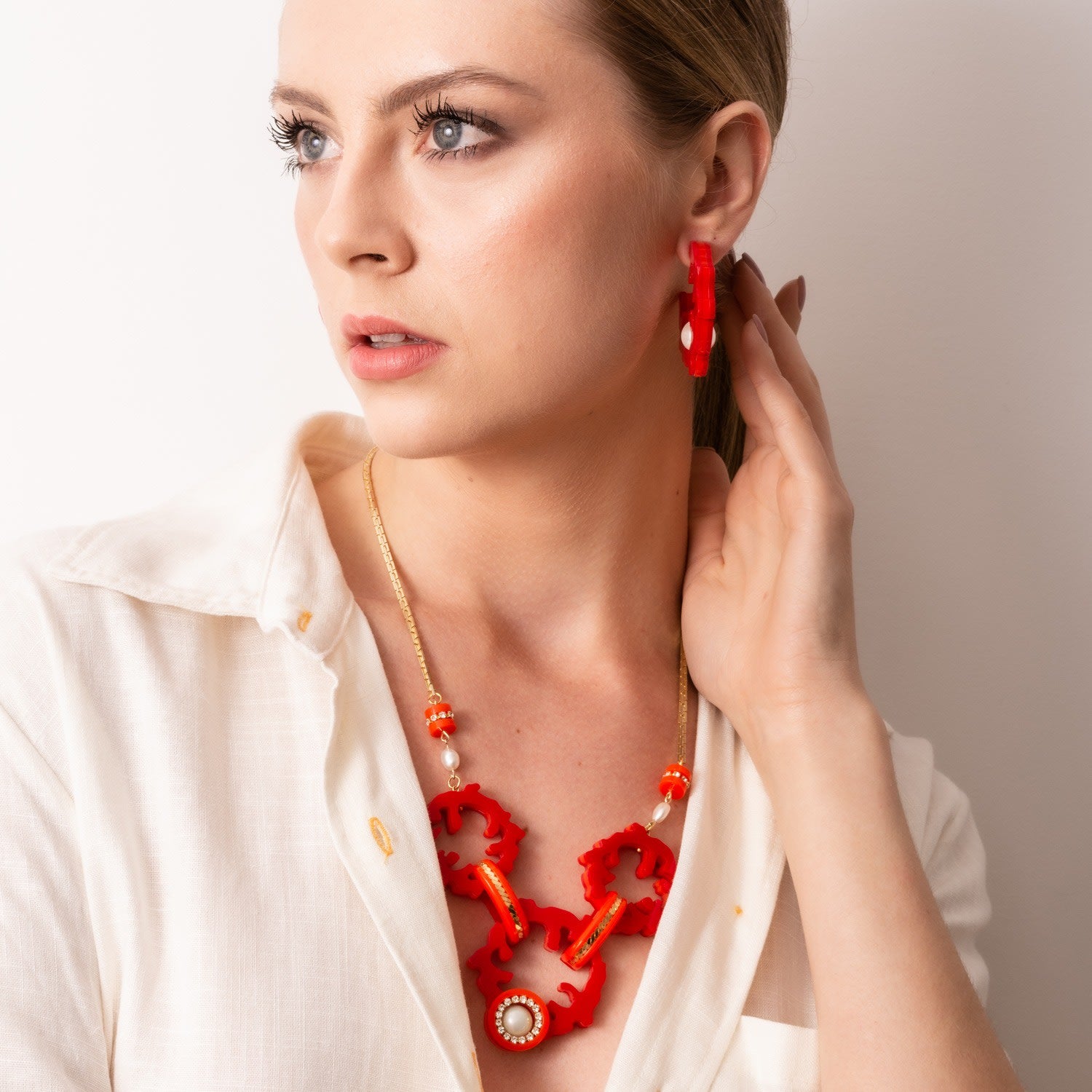 This Handmade Necklace Hoop Coral Red by Gissa Bicalho is a bold and artistic accessory. The necklace is made of acrylic and features a hoop design with a cabochon pearl and glass rhinestones. Its handcrafted nature and vibrant coral-red color make it a one-of-a-kind statement piece that adds a touch of creative flair to any outfit.