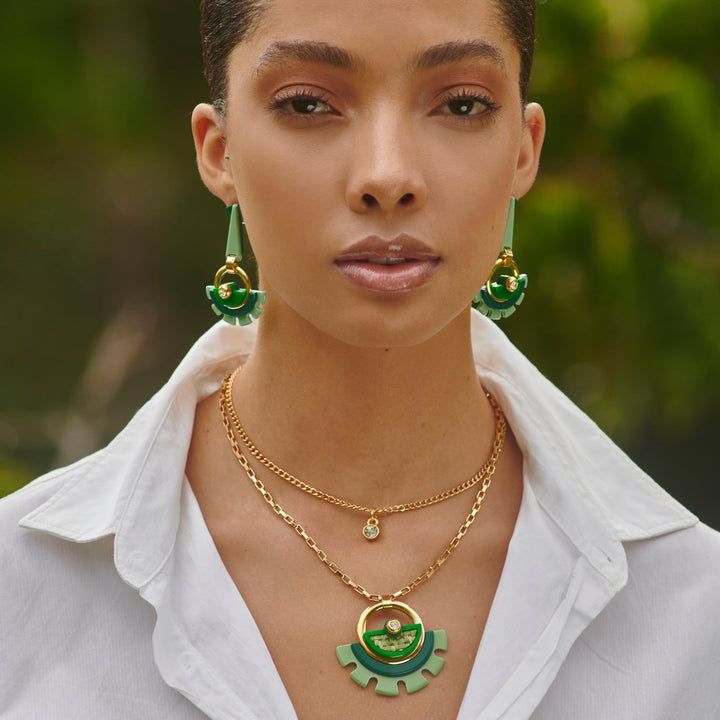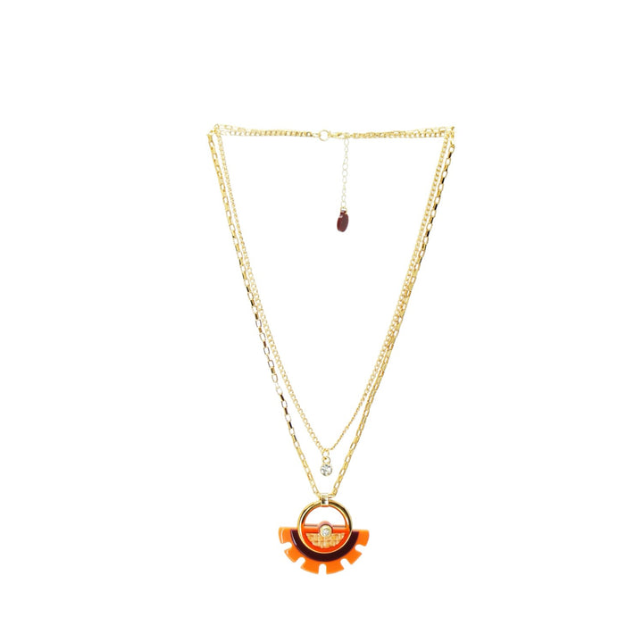 This handmade necklace is crafted from acrylic with glass rhinestones, a zamak hoop, and golden-finished brass chains. Small variations in color and finish are expected due to the manual process.