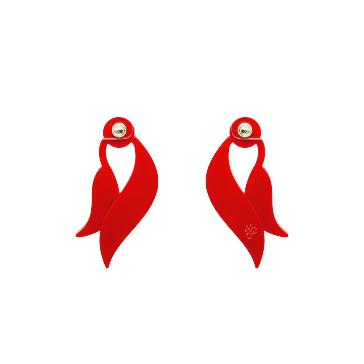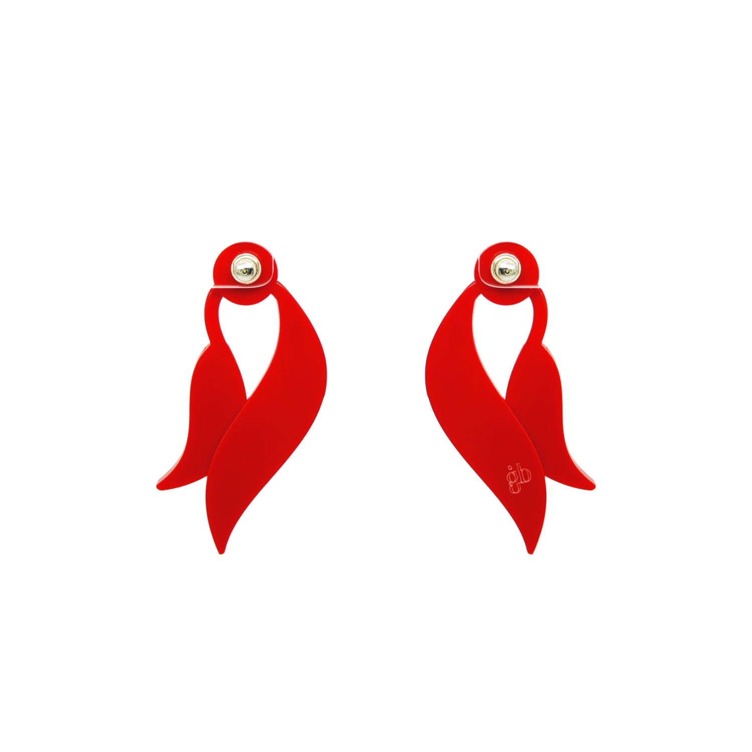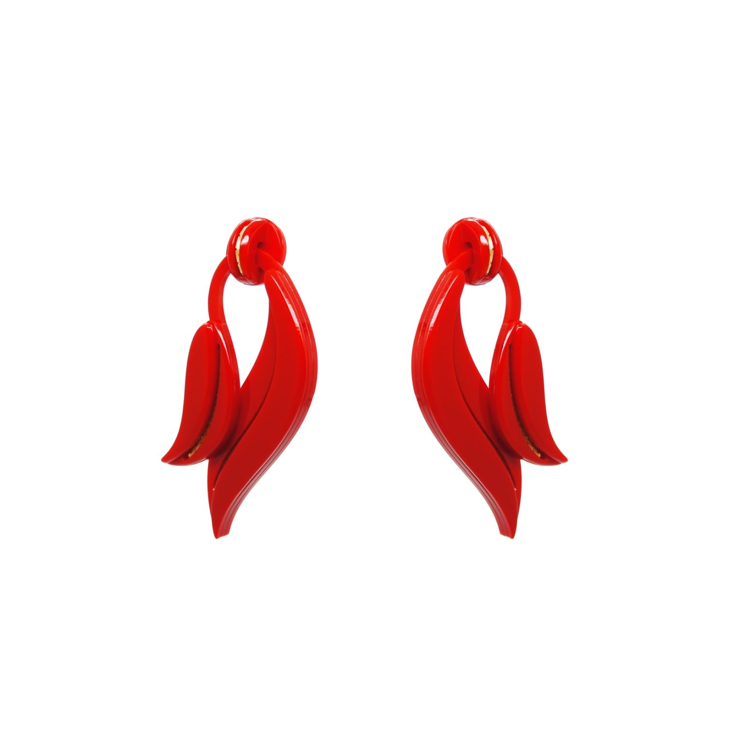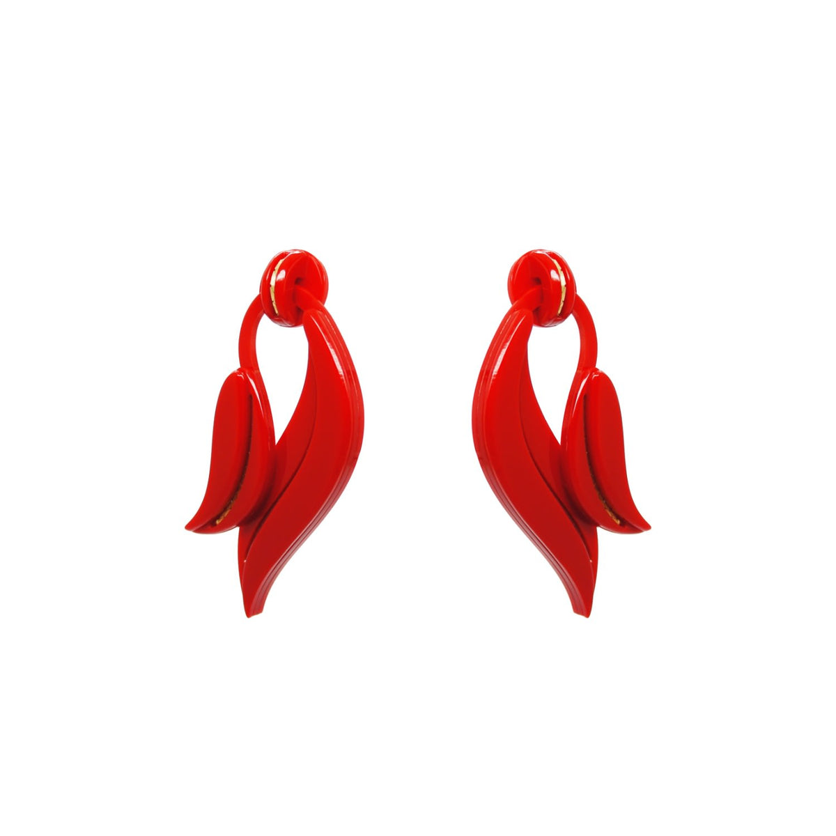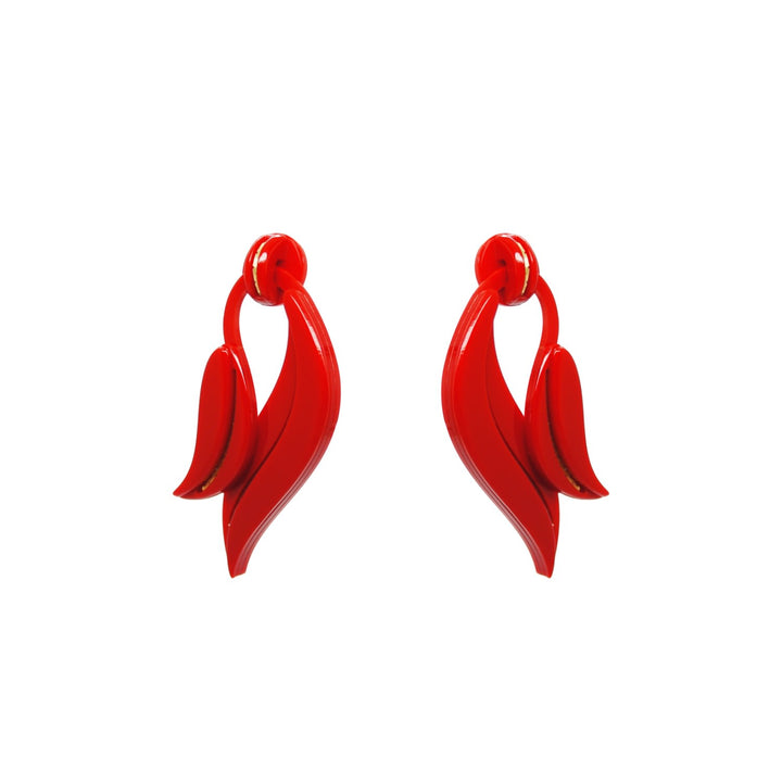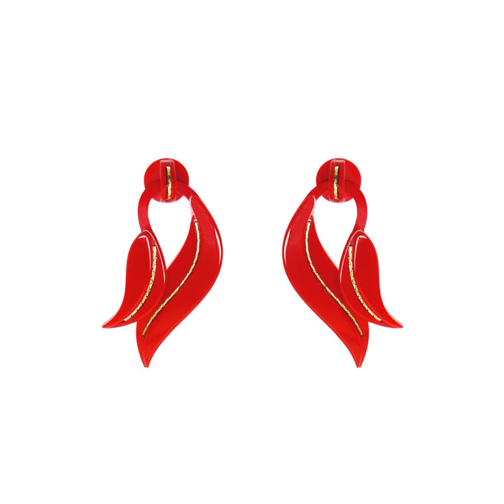 These Acrylic Handmade Earring Leaf Deco Red by Gissa Bicalho are an artistic and unique accessory. The articulated earrings feature a leaf deco design made of acrylic, with a golden-finished brass chain. The design and vibrant color make them a fun and stylish statement piece. Each pair is slightly unique, reflecting the manual process of Brazilian artisans.