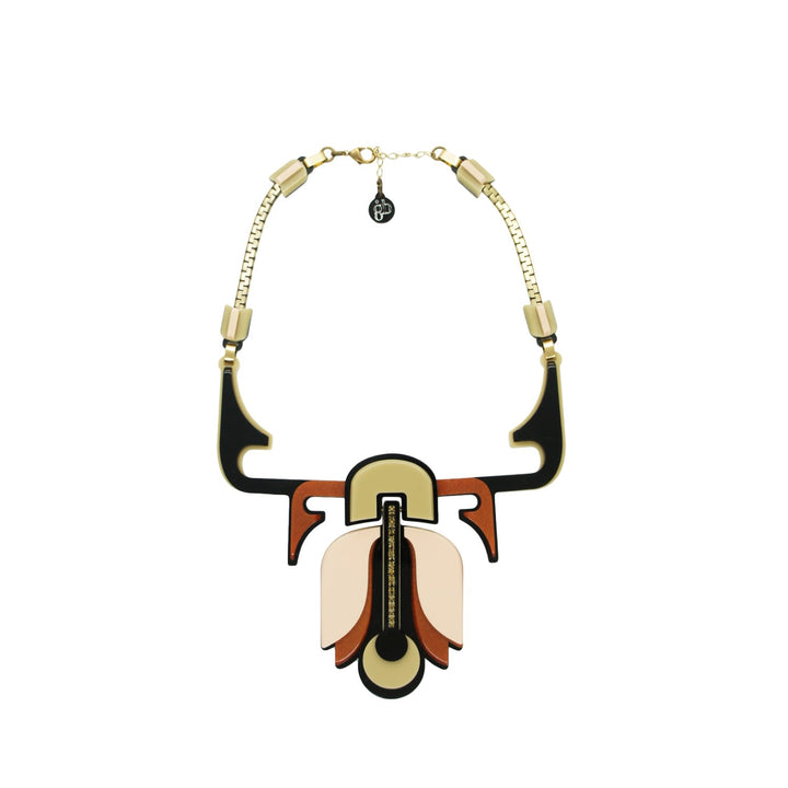 This handmade necklace is crafted from acrylic with glass rhinestones and a chain and features metals with a golden finish. Small variations in color and finish are expected.