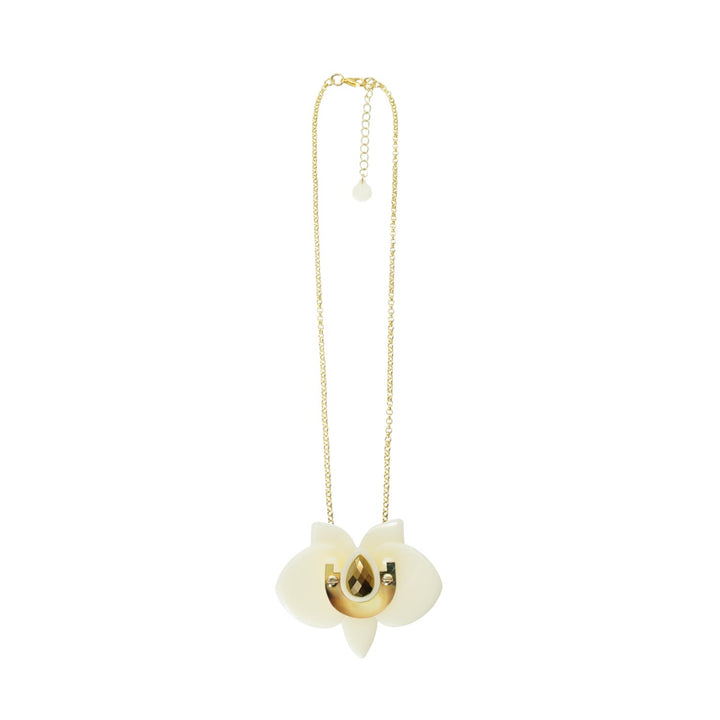 This Acrylic Handmade Necklace Orchid Pendant Cream by Gissa Bicalho is a vibrant and artistic piece. The cream acrylic orchid pendant is adorned with a mirrored glass stone, delicate filigree, and a golden-finished brass chain. Its handcrafted nature ensures that each piece is slightly unique, adding a personal and one-of-a-kind touch to your style.