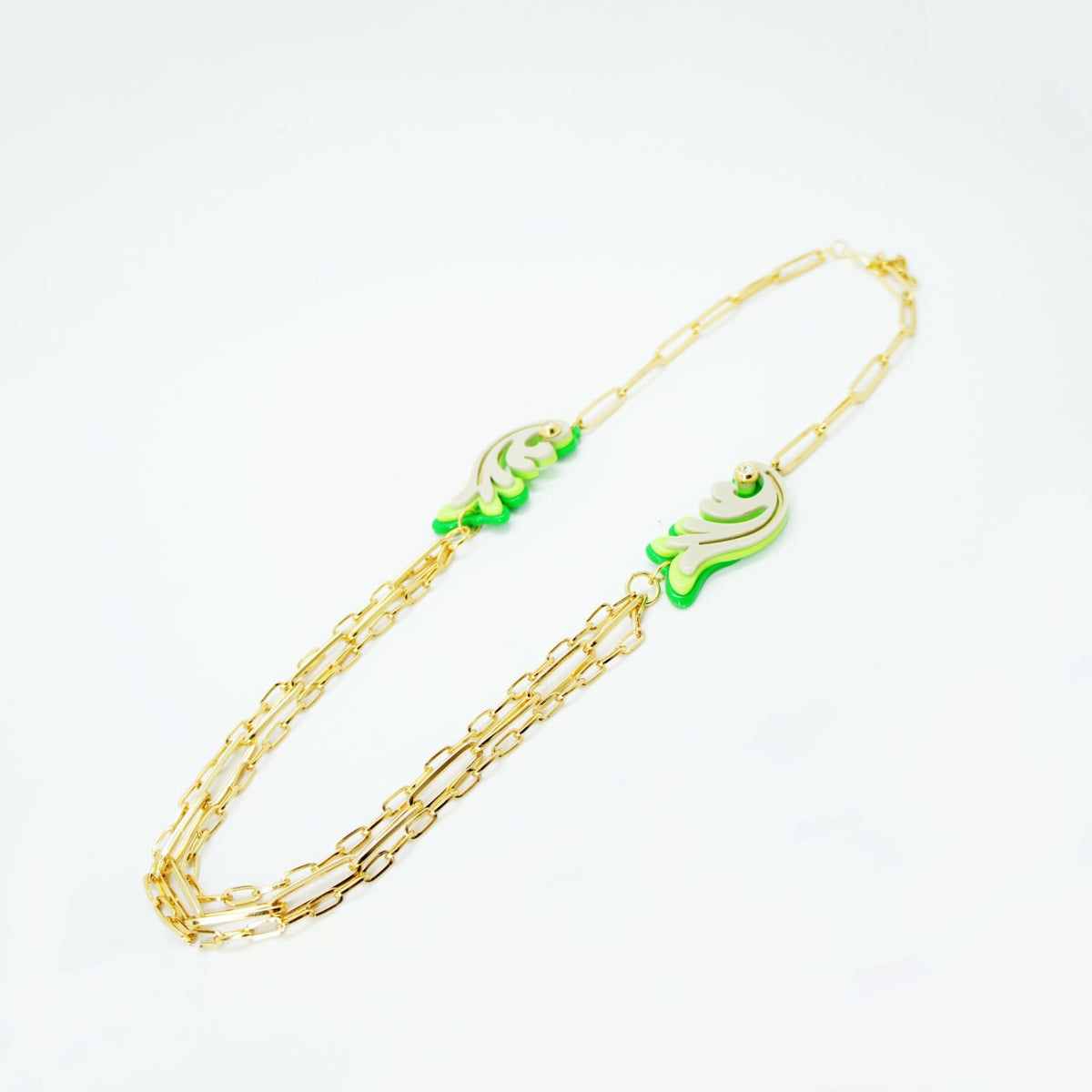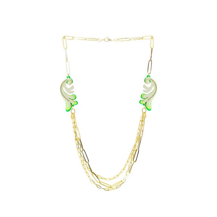 This handmade necklace is crafted from acrylic with glass rhinestones, zamak pieces, and a golden-finished brass chain. Small variations in color and finish are expected due to the manual process.