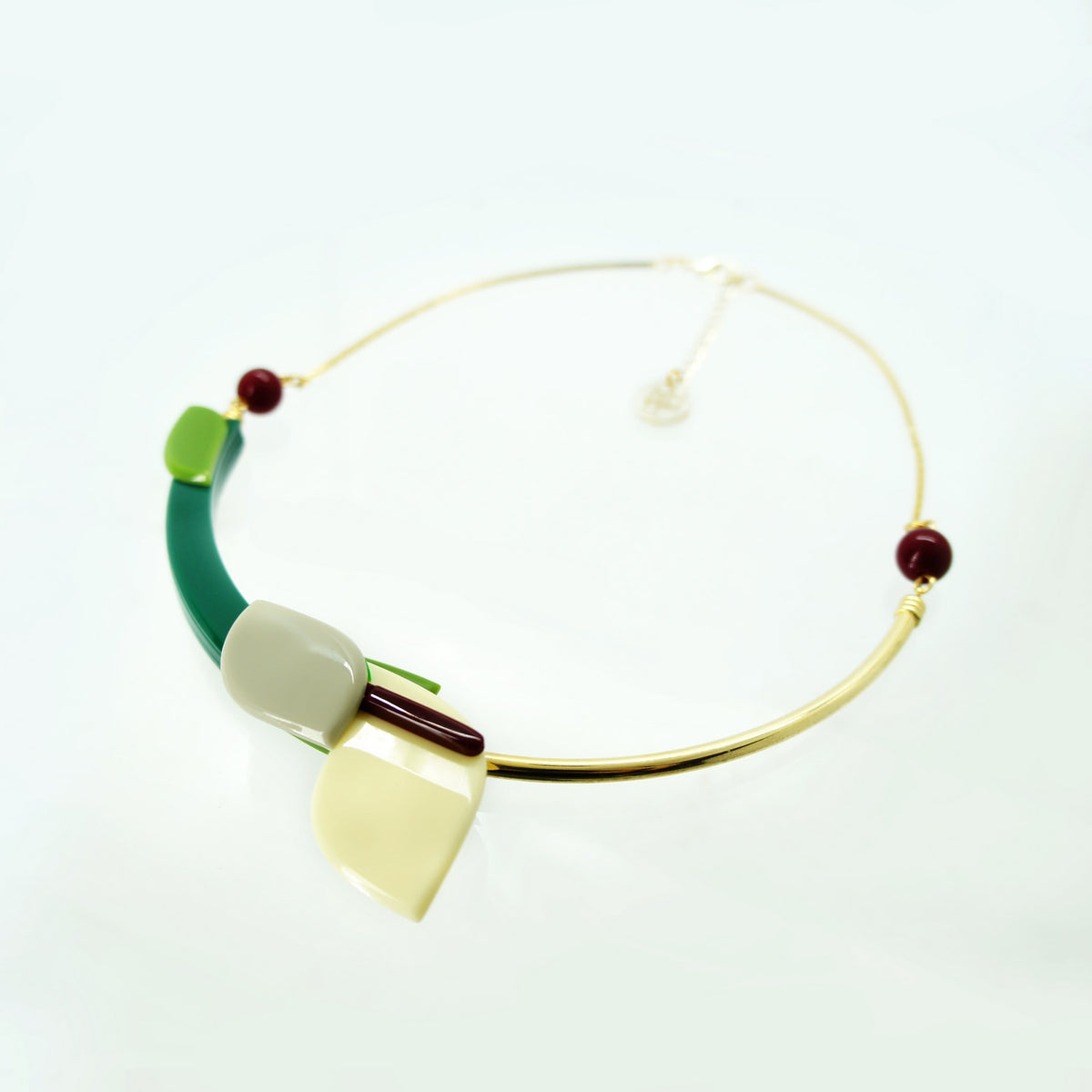 This handmade choker necklace is crafted from acrylic with a metal rod and synthetic beads. The metals have a golden finish. Use a dry cloth for cleaning and avoid contact with alcohol, perfume, and cosmetics.