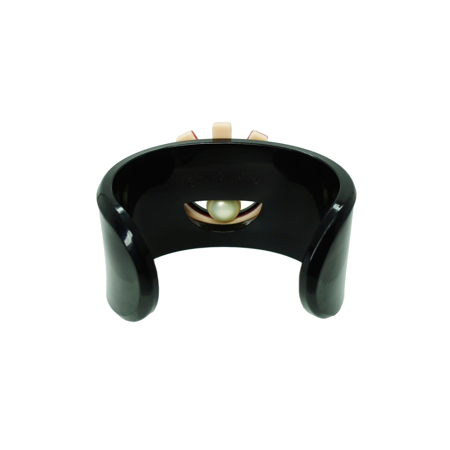 This Handmade Acrylic Bracelet Eye Black by Gissa Bicalho is a bold and unique cuff bracelet. The cuff design features a pearl shell eye motif, adorned with a chain and gold-finished metal. Its handcrafted nature ensures that each piece is unique, adding a personal and one-of-a-kind touch to your style.
