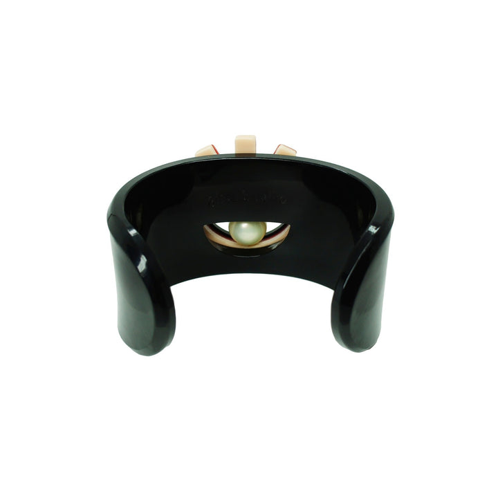 This handmade cuff bracelet is crafted from acrylic and features a pearl shell, a chain, and gold-finished metal. It is not adjustable. Small variations in color and finish are expected. To clean, use a dry cloth or mesh and avoid contact with alcohol, perfume, and cosmetics.