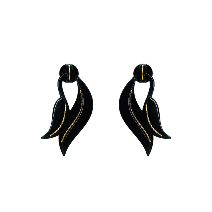 These Acrylic Handmade Earring Leaf Deco Black by Gissa Bicalho are an artistic and modern accessory. The articulated earrings feature a leaf deco design made of acrylic, with a golden-finished brass chain. The design and black color make them a bold and stylish statement piece. Each pair is slightly unique, reflecting the manual process of Brazilian artisans.