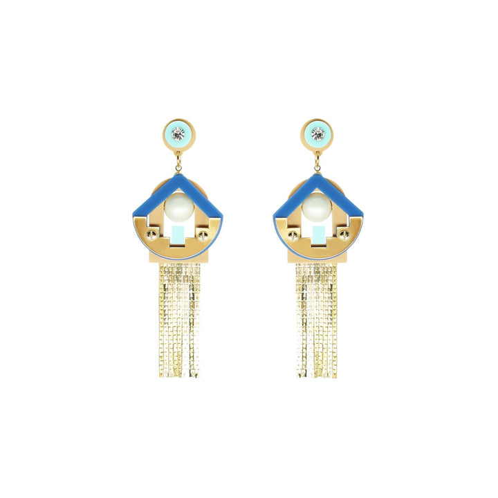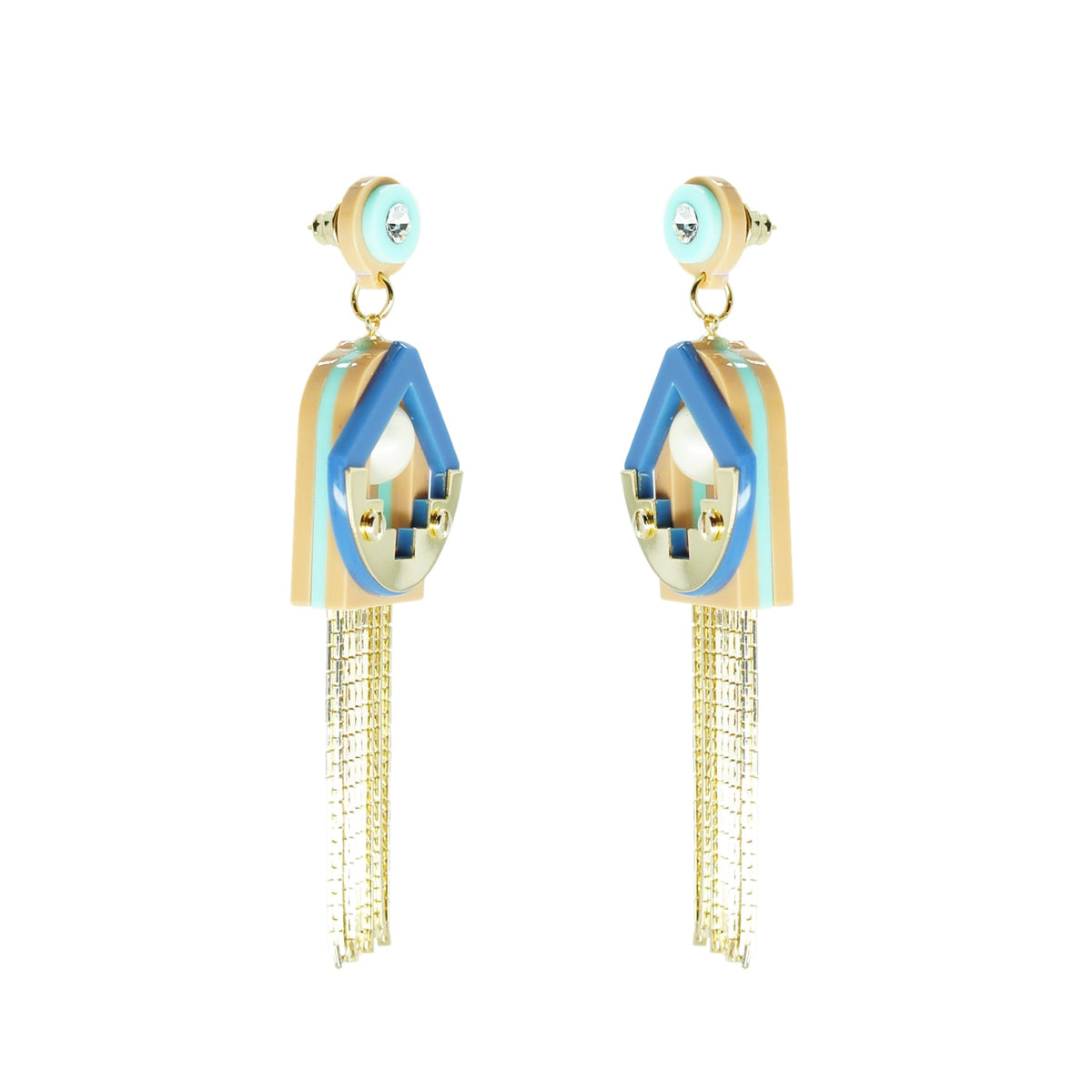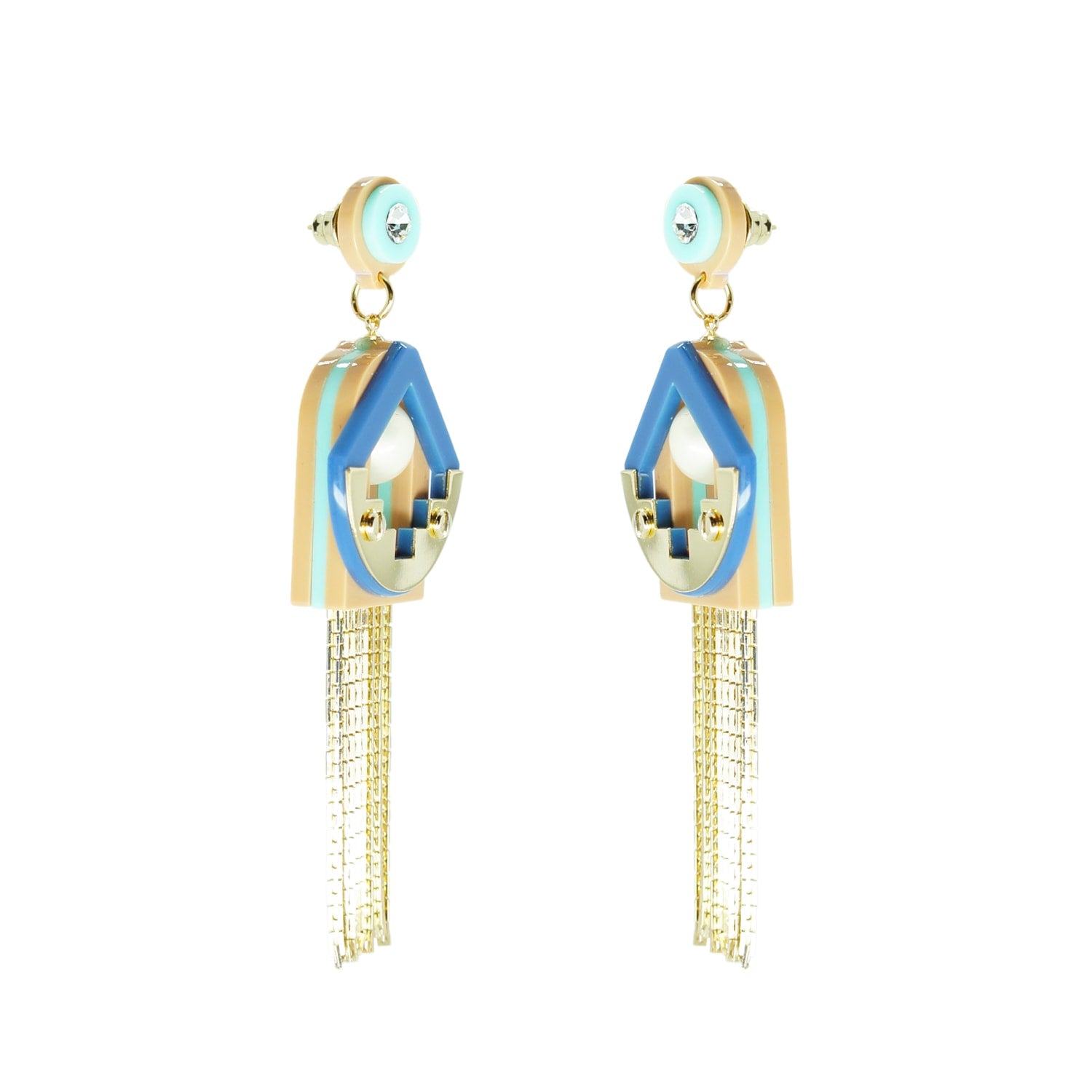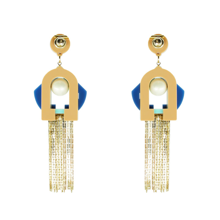 These handmade chandelier earrings are crafted from acrylic with glass rhinestones, a shell pearl bead, and a chain fringe. The metals have a gold finish. Small variations in color and finish are expected. Use a dry cloth for cleaning and avoid contact with alcohol and perfumes.