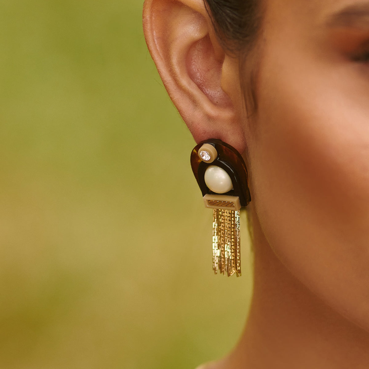 These handmade earrings are crafted from acrylic with a chain fringe, a pearl shell, and glass rhinestones. The metals have a gold finish. Small variations in color and finish are expected. Use a dry cloth for cleaning and avoid contact with alcohol and perfumes.