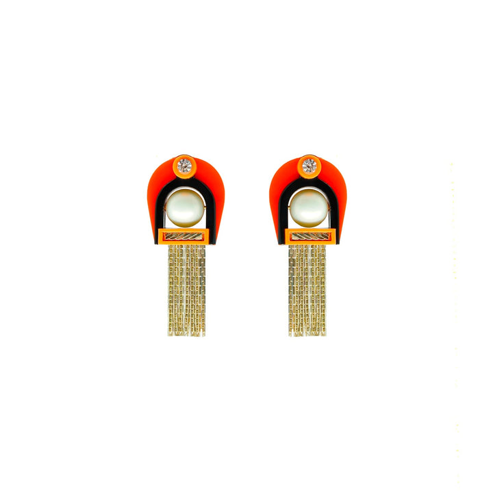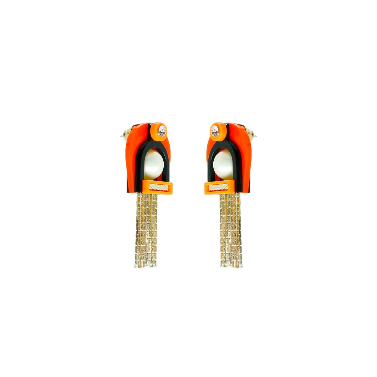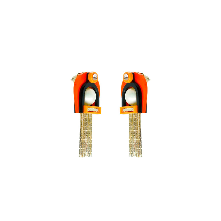These Handmade Acrylic Earring Tiger - Yellow & Orange by Gissa Bicalho are a unique and artistic accessory. The acrylic earrings feature a design with a chain fringe and an application of a pearl shell and glass rhinestones. The vibrant yellow and orange colors, along with the handmade nature, make them a statement piece.