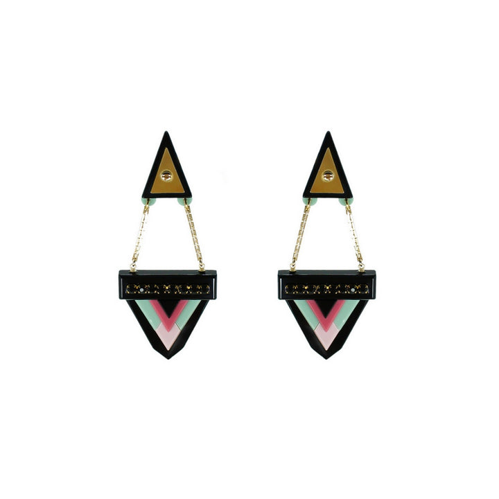 These handmade pendant earrings are crafted from acrylic with glass rhinestones, a golden metal ornament, and a chain. The metals have a golden finish. Small variations in color and finish are expected. Use a dry cotton cloth for cleaning and avoid contact with alcohol and perfumes.
