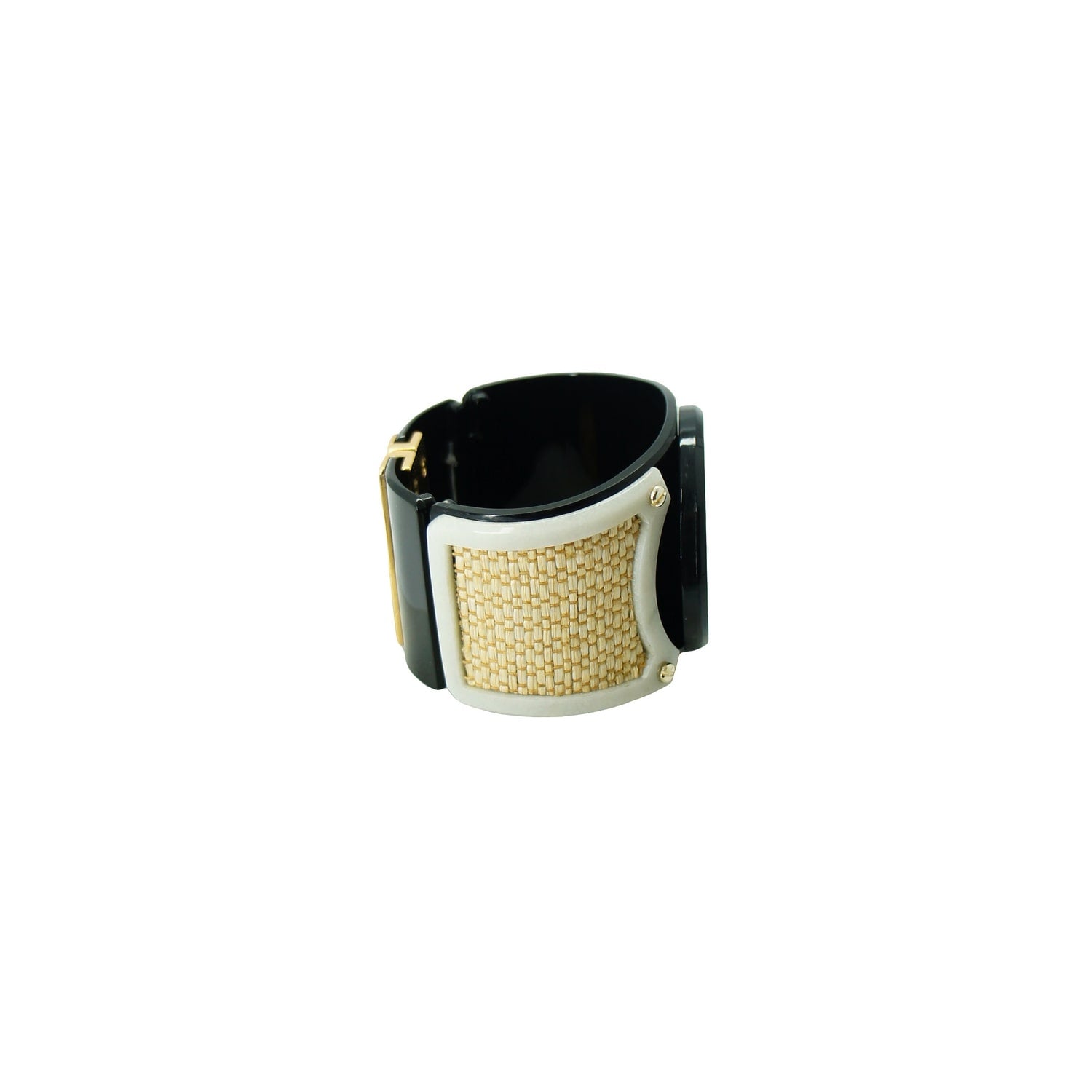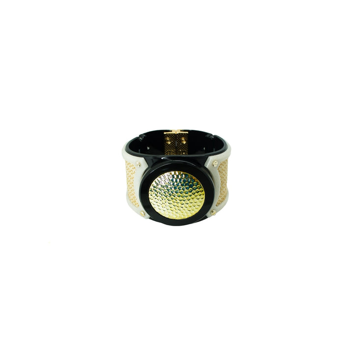 This bracelet is crafted from acrylic with a brass ornament, a magnetic clasp, and gold-plated metals. It's available in sizes XS, S, M, and L. To maintain its quality, use a dry cloth for cleaning and avoid contact with alcohol and perfumes.
